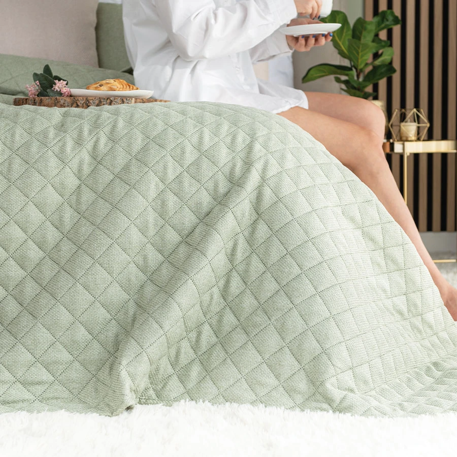 Narzuta MOLLY to nie tylko komfort, ale również wyjątkowy design. Delikatny pikowany wzór dodaje jej elegancji i podkreśla wysoką jakość wykonania. Szałwiowy odcień doskonale komponuje się z różnorodnymi stylami wnętrzarskimi – od klasycznych po nowoczesne. Narzuta będzie idealnym uzupełnieniem aranżacji sypialni, dodając jej świeżości, ale także świetnie sprawdzi się w salonie jako stylowy dodatek do sofy lub fotela.