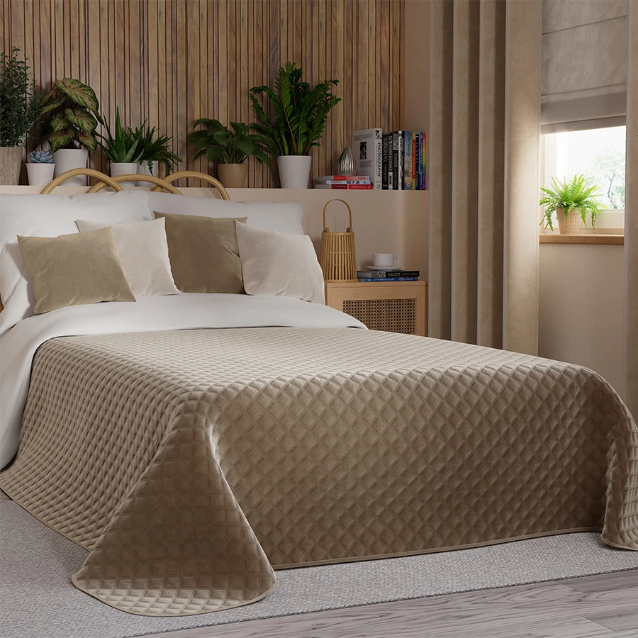 Szukasz sposobu na szybką metamorfozę swojej sypialni. Narzuta VELVI w odcieniu ciepłego ciemnego beżu to idealny wybór! Jej aksamitna tekstura i głęboki, nasycony kolor wprowadzą do Twojego wnętrza nutę luksusu i elegancji. Wyobraź sobie, jak pięknie będzie się prezentować na Twoim łóżku, dodając mu wyrafinowanego charakteru.