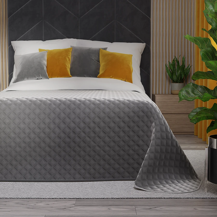 Narzuta dekoracyjna VELVI w odcieniu chłodnego szarości to kwintesencja nowoczesnego designu i subtelnego luksusu. Jej stonowany kolor i geometryczny, pikowany wzór tworzą harmonijną kompozycję, która dodaje wnętrzu spokoju i elegancji. Miękka, przyjemna w dotyku faktura narzuty zapewnia nie tylko estetyczny wygląd, ale także komfort i relaks. Starannie wykonana narzuta VELVI to doskonały wybór dla osób, które cenią sobie minimalistyczne, ale wyrafinowane dodatki do wnętrz.
