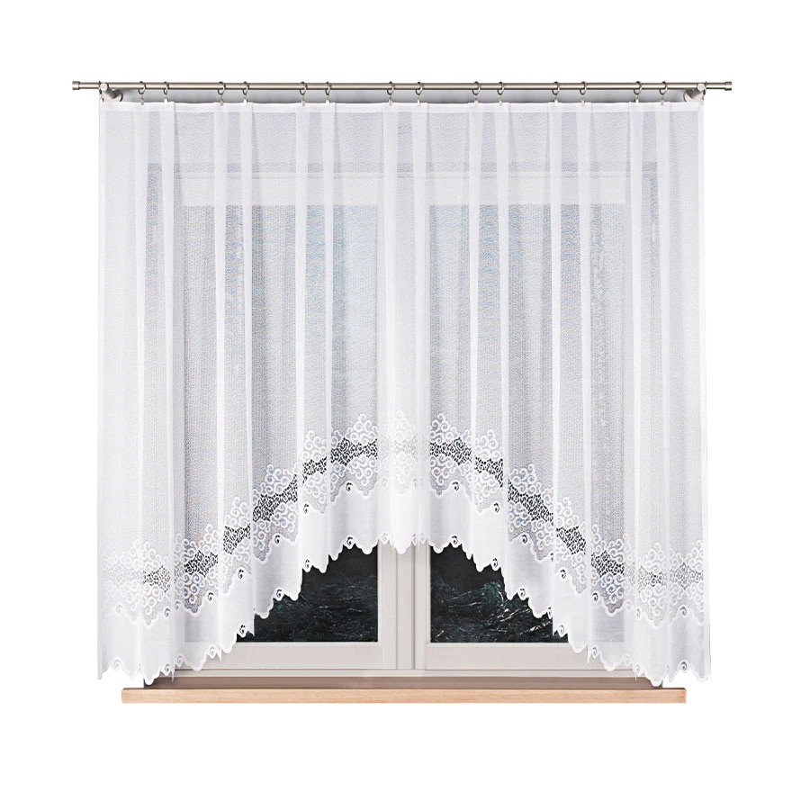 MODESTA to gotowa firanka żakardowa o wymiarach 300x160 cm, która doskonale sprawdzi się na większych oknach, wprowadzając do pomieszczenia elegancję i delikatny styl. Biały materiał ozdobiony dekoracyjnym, misternym wzorem oraz subtelnym podcięciem na dole nadaje oknu wyjątkowy charakter. Firanka pięknie przepuszcza światło, rozjaśniając przestrzeń i tworząc w niej przytulną, harmonijną atmosferę.