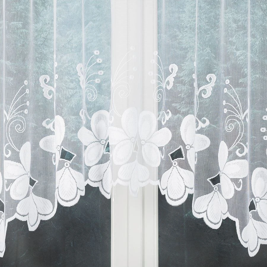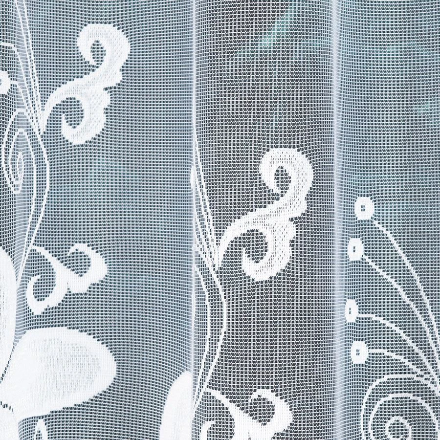 Firanka żakardowa TEODORA w rozmiarze 300x140 cm to wyjątkowa dekoracja, która zachwyca subtelnością i finezją. Biały żakardowy materiał ozdobiony został pięknym, delikatnym wzorem kwiatowym, który lekko rozprasza światło, tworząc we wnętrzu jasny, przytulny klimat. Ozdobne podcięcie na dole przypominające kaskadę kwiatów nadaje firance lekkości i elegancji, czyniąc ją wyjątkową ozdobą okna.