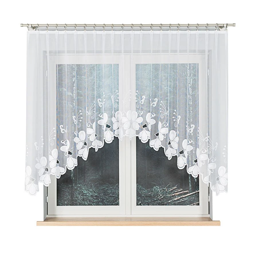 - Eleganckie podcięcie – nietypowe wykończenie dolnej krawędzi dodaje lekkości i wyróżnia firankę na tle innych modeli.