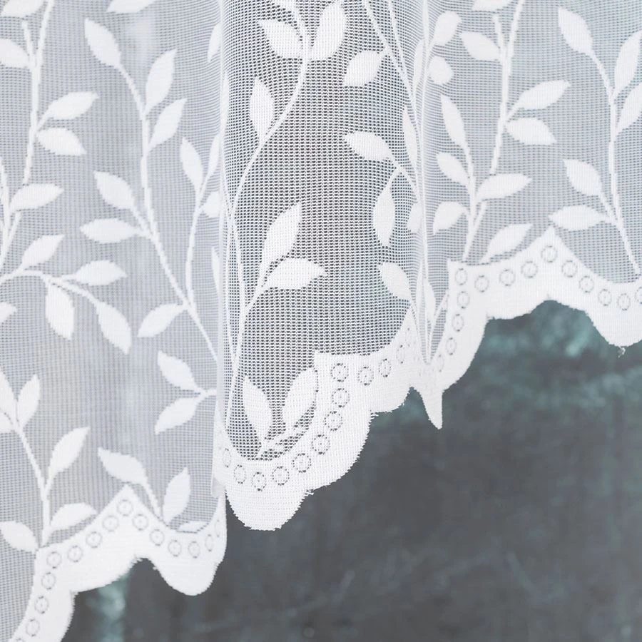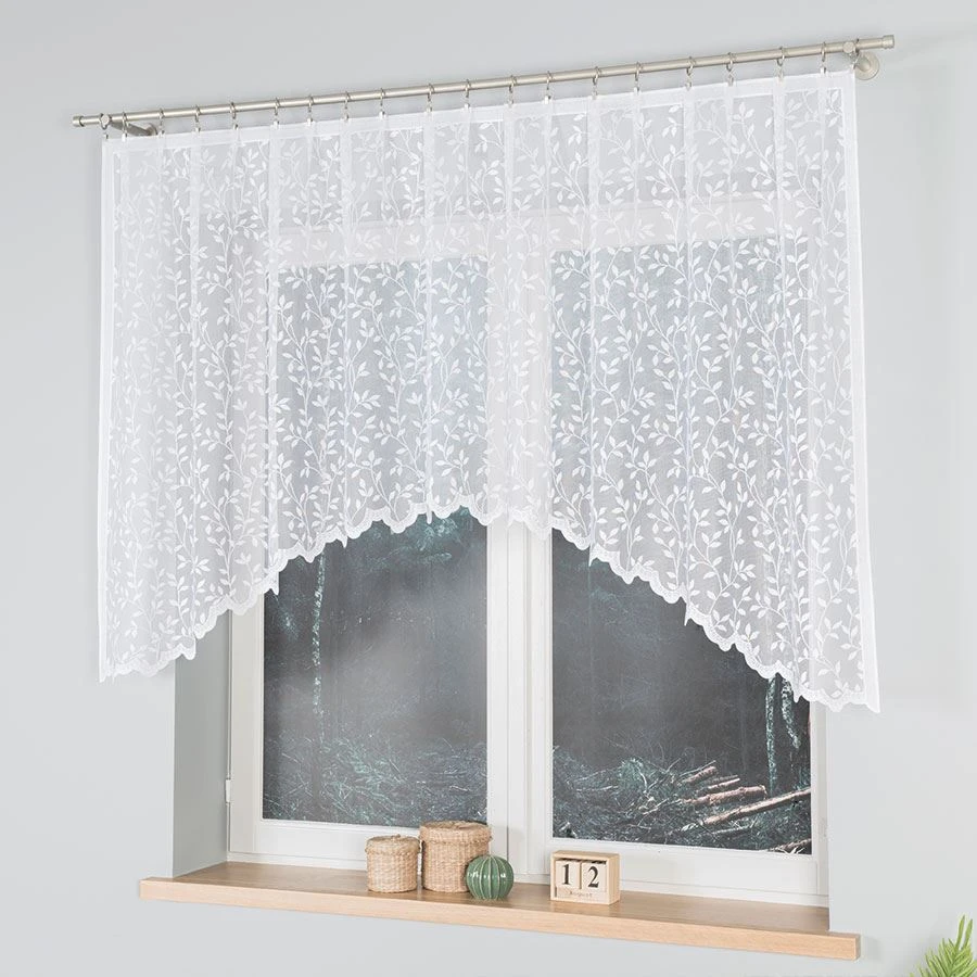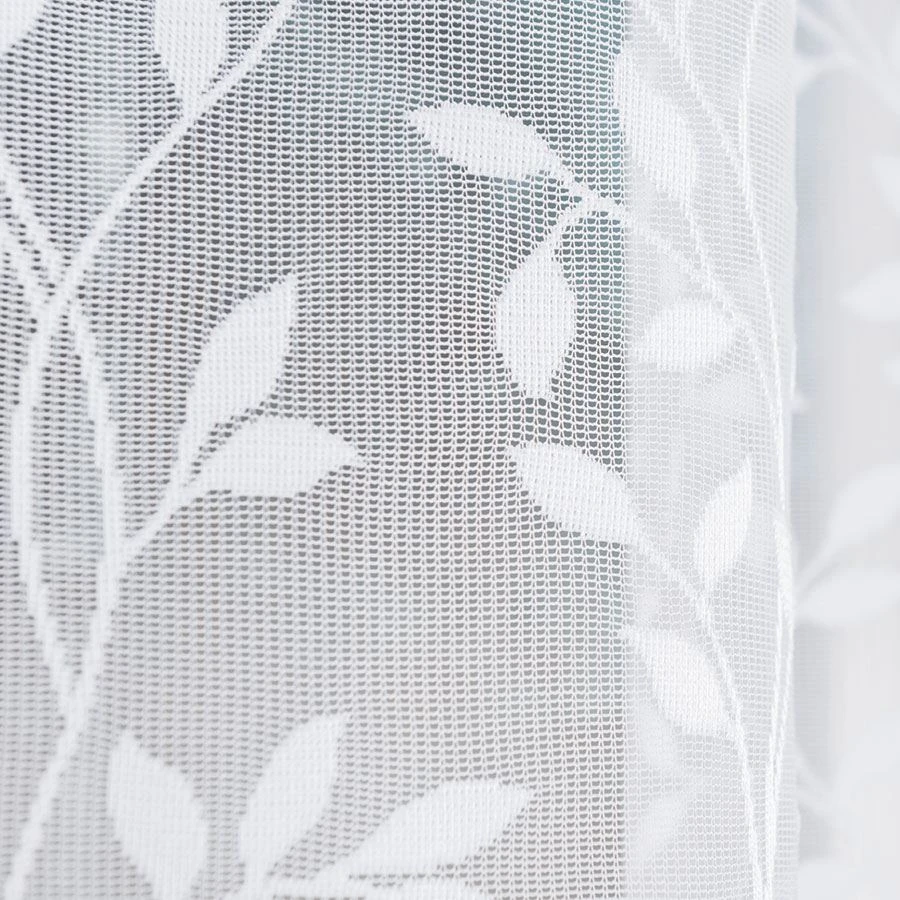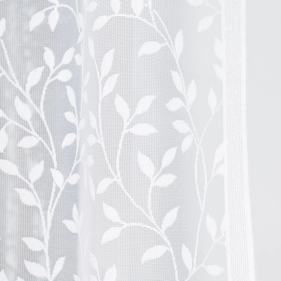 Firanka uszyta z białego żakardu o drobnym splocie pięknie przepuszcza światło, a dzięki motywowi delikatnych gałązek wprowadza do wnętrza świeżość i naturalny klimat. Miękkie, łukowe podcięcie sprawia, że całość prezentuje się subtelnie i lekko.