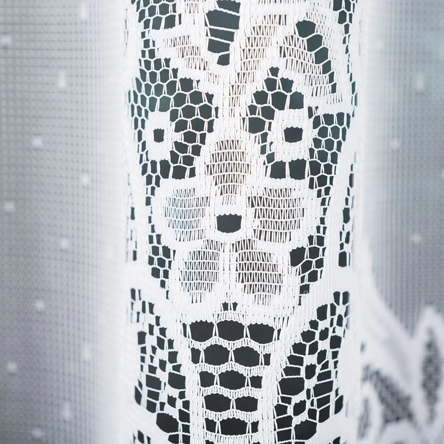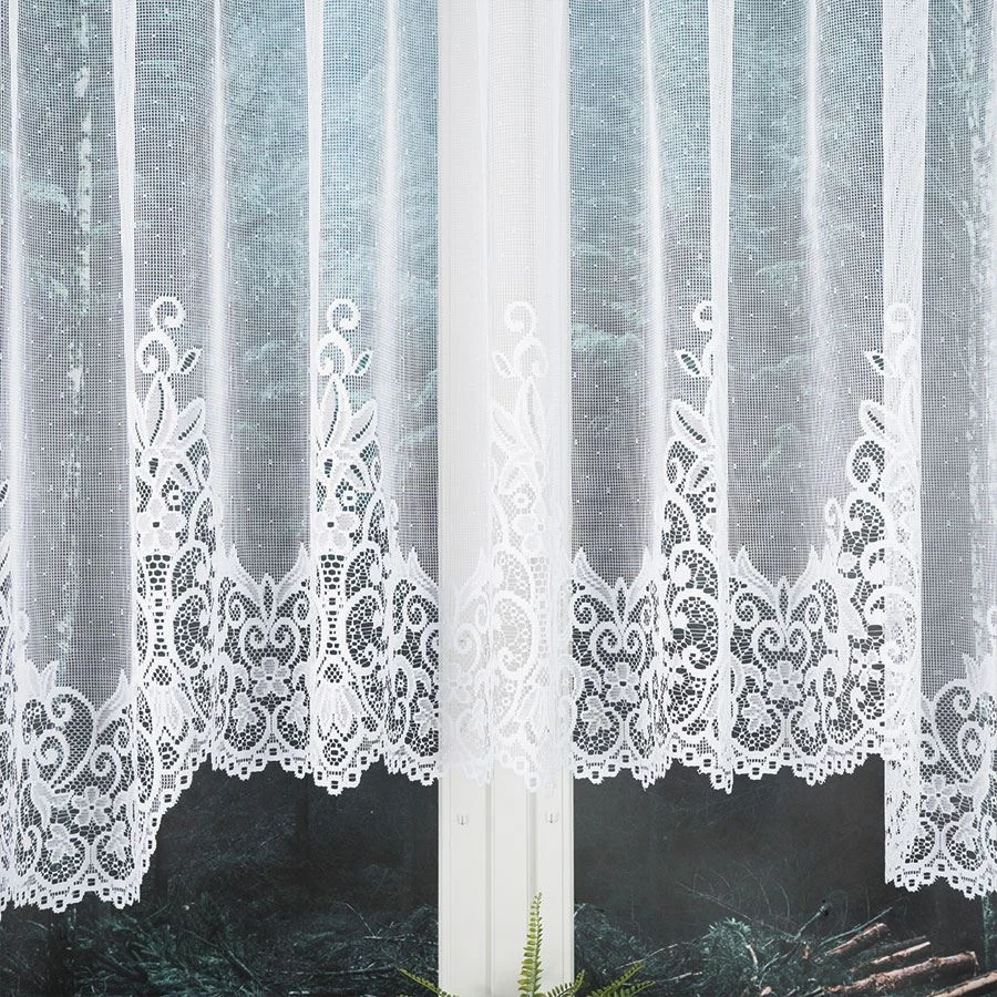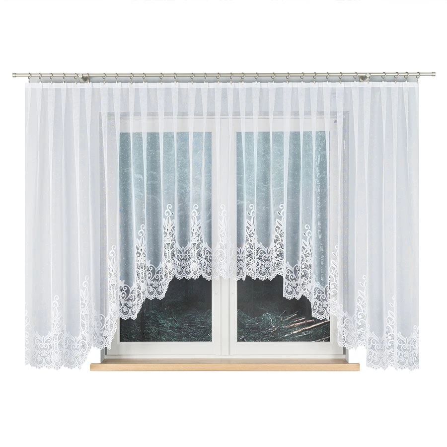 Model w kolorze białym wykonano z lekkiej dzianiny żakardowej o gramaturze 80–90 g/m². Ozdobne ornamenty pięknie podkreślają aranżację, a charakterystyczne podcięcie na dole nadaje całości subtelnej lekkości. Firana jest pojedyncza, w rozmiarze 530x160 cm i została przygotowana do zawieszenia na żabki. Boki mają fabryczne wykończenie, dzięki czemu nie wymagają obszycia, a dół jest laserowo wytapiany dla estetycznego efektu.