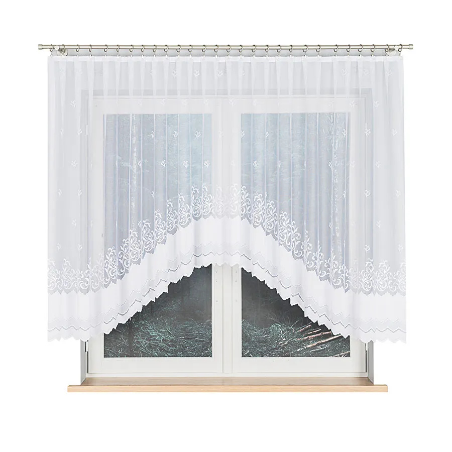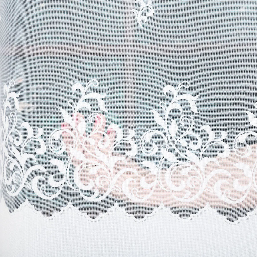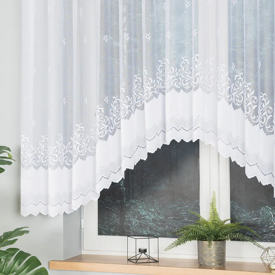 Firanka wyróżnia się dekoracyjnym podcięciem w łuk, które zostało wykończone geometryczno-roślinnym wzorem – delikatnym, a zarazem efektownym 🌸. Taki detal doskonale sprawdza się zarówno w klasycznych, jak i nowoczesnych aranżacjach, wprowadzając do wnętrza elegancję bez przesady.