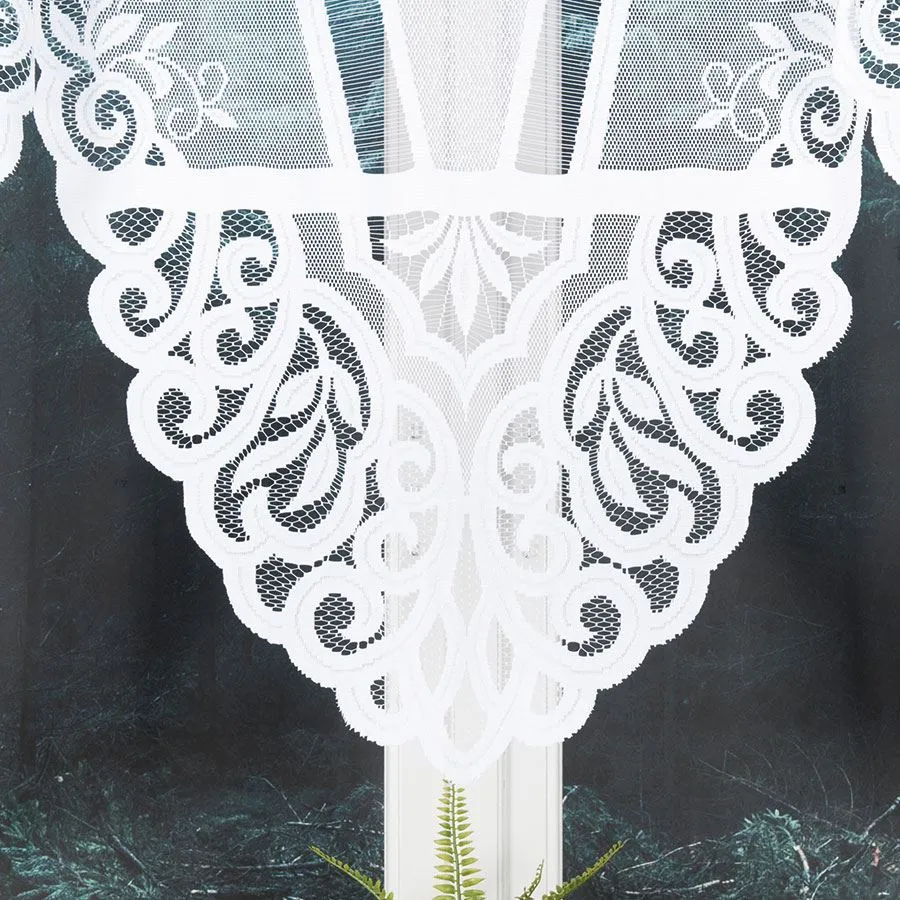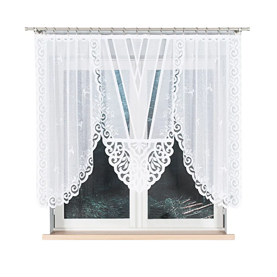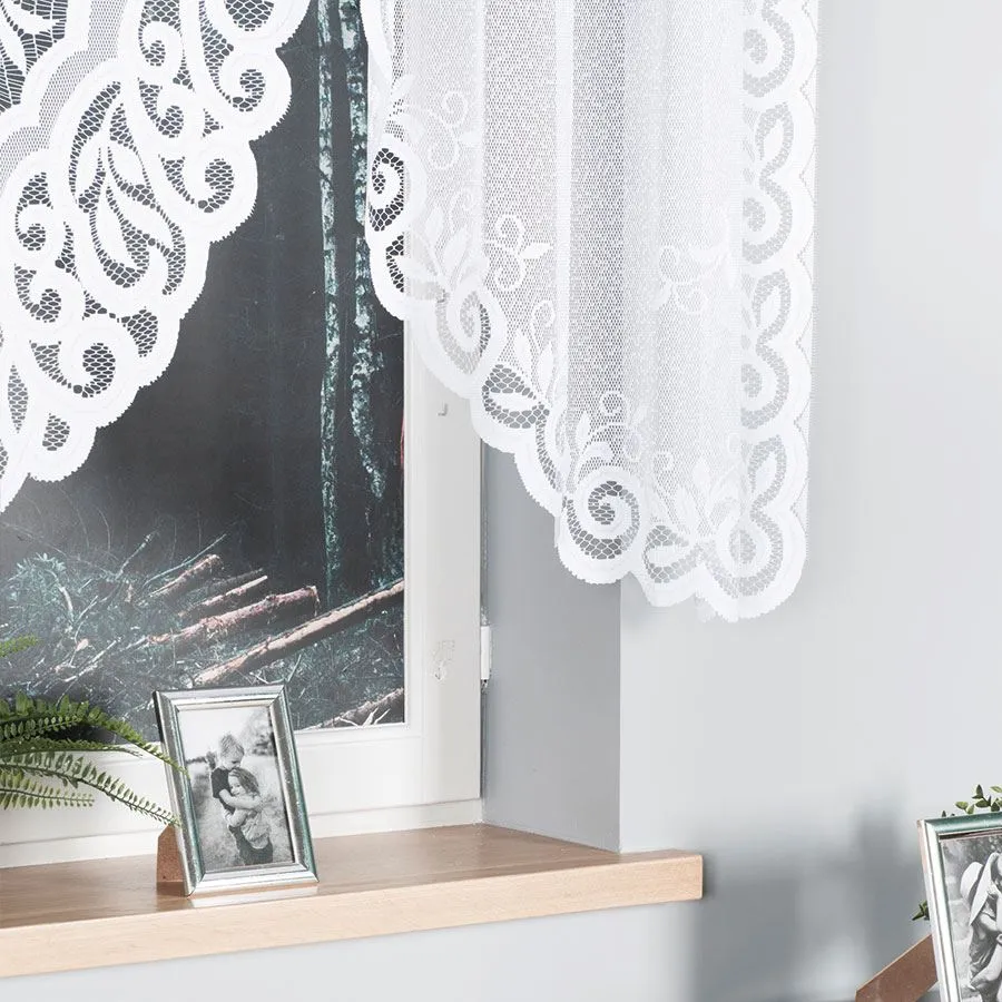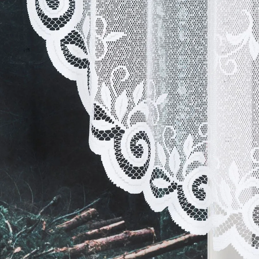 Wzór z dekoracyjnych zawijasów tworzy finezyjny ornament, który uzupełnia głębokie podcięcie w dolnej części firanki. To połączenie sprawia, że ROZALIA prezentuje się bardzo efektownie, nie przytłaczając przestrzeni.