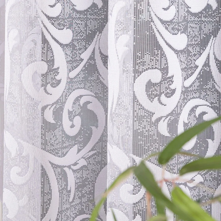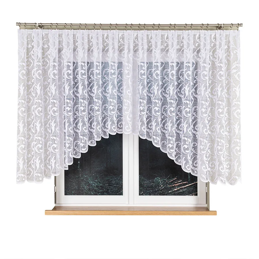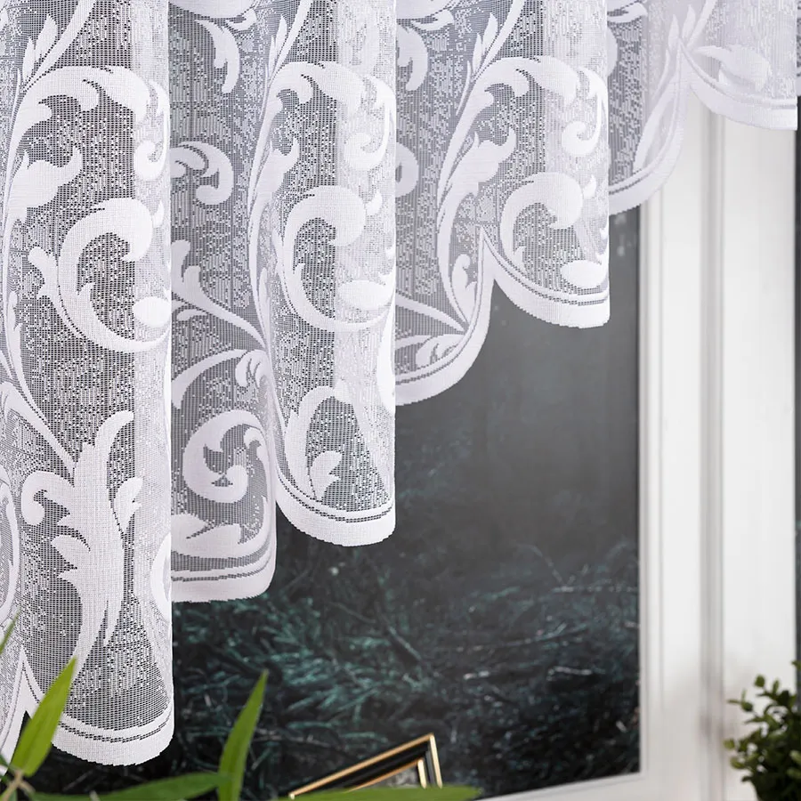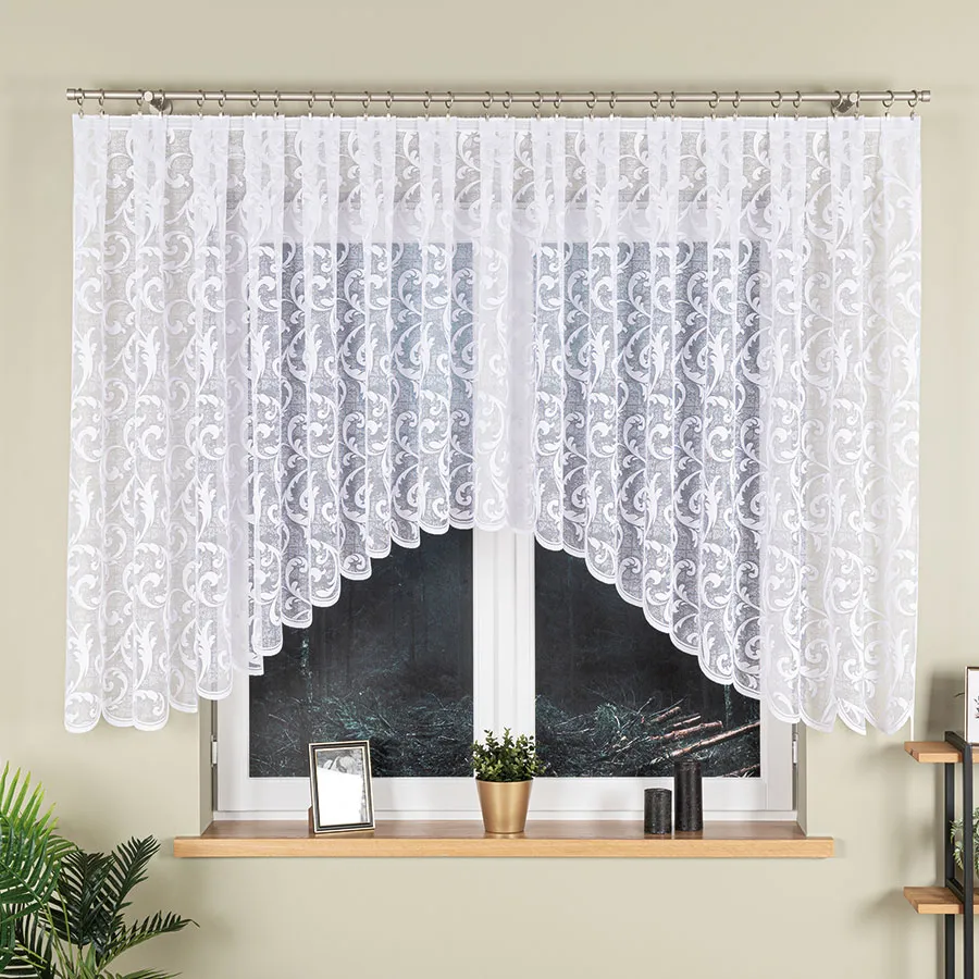 Dzięki klasycznej bieli i bogatemu wzornictwu firanka ta rozjaśnia przestrzeń i stanowi eleganckie tło dla wnętrza. Delikatne podcięcie nadaje całości lekkości, a żakardowy materiał jest łatwy w utrzymaniu i pięknie układa się na oknie.