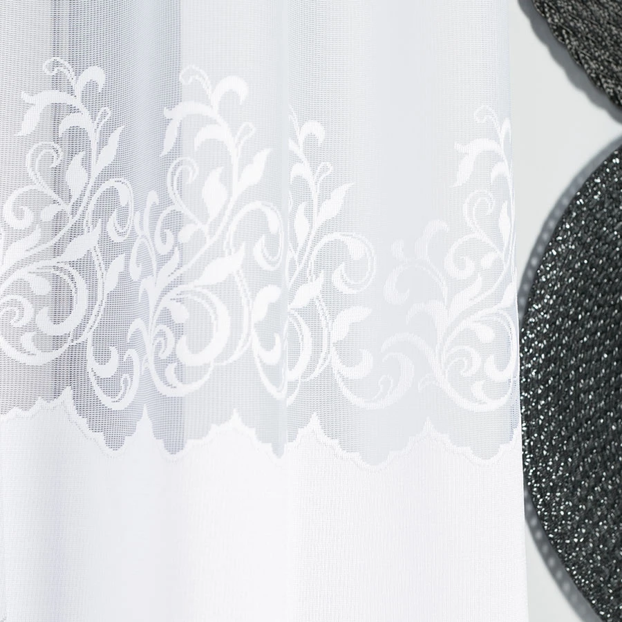 Firanka zachwyca podcięciem w łuk, które zostało elegancko wykończone geometrycznym motywem z delikatnymi akcentami florystycznymi 🌸. To rozwiązanie nie tylko ozdabia, ale też optycznie modeluje okno i wprowadza do przestrzeni lekkość i równowagę.