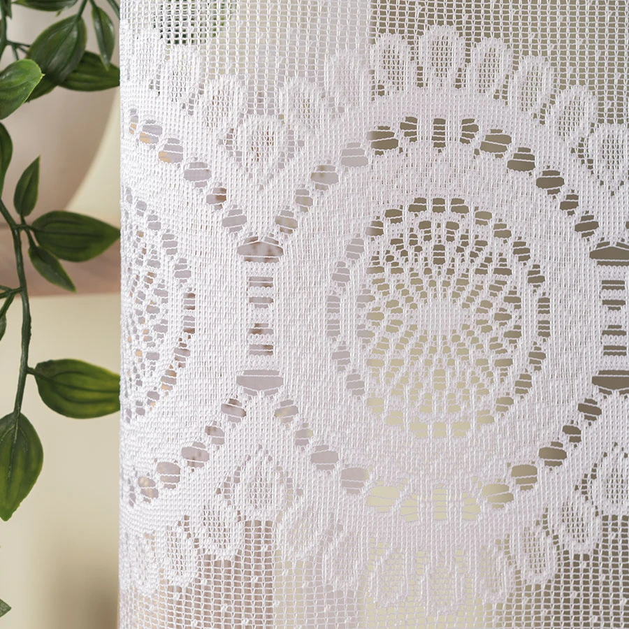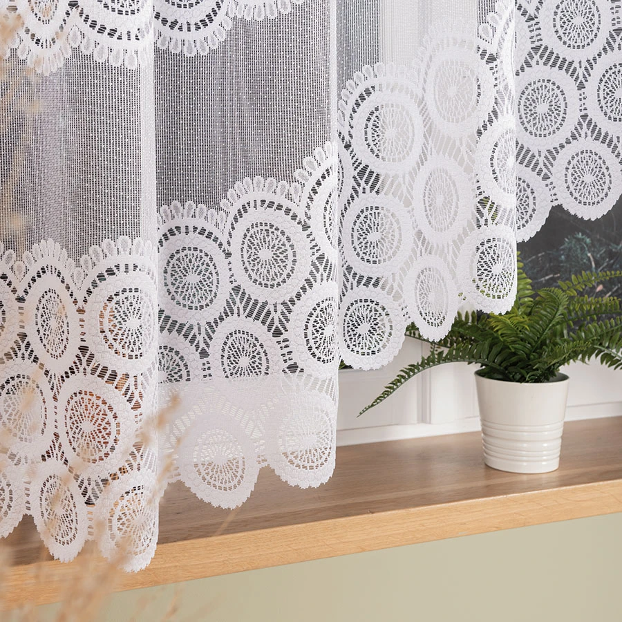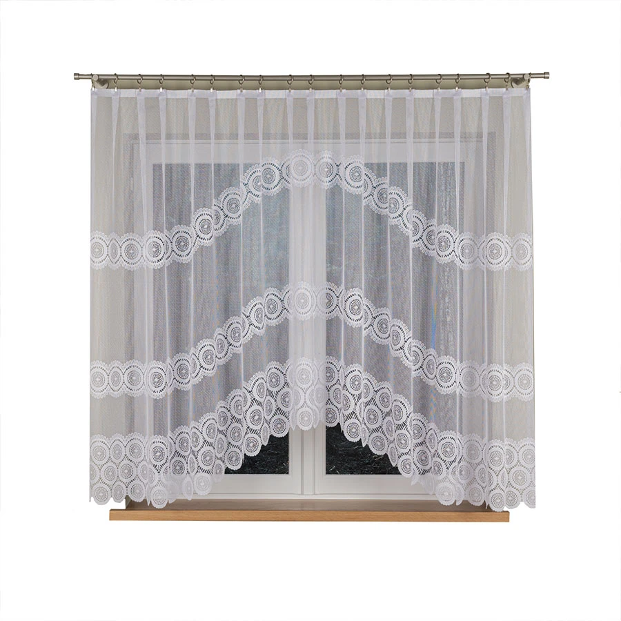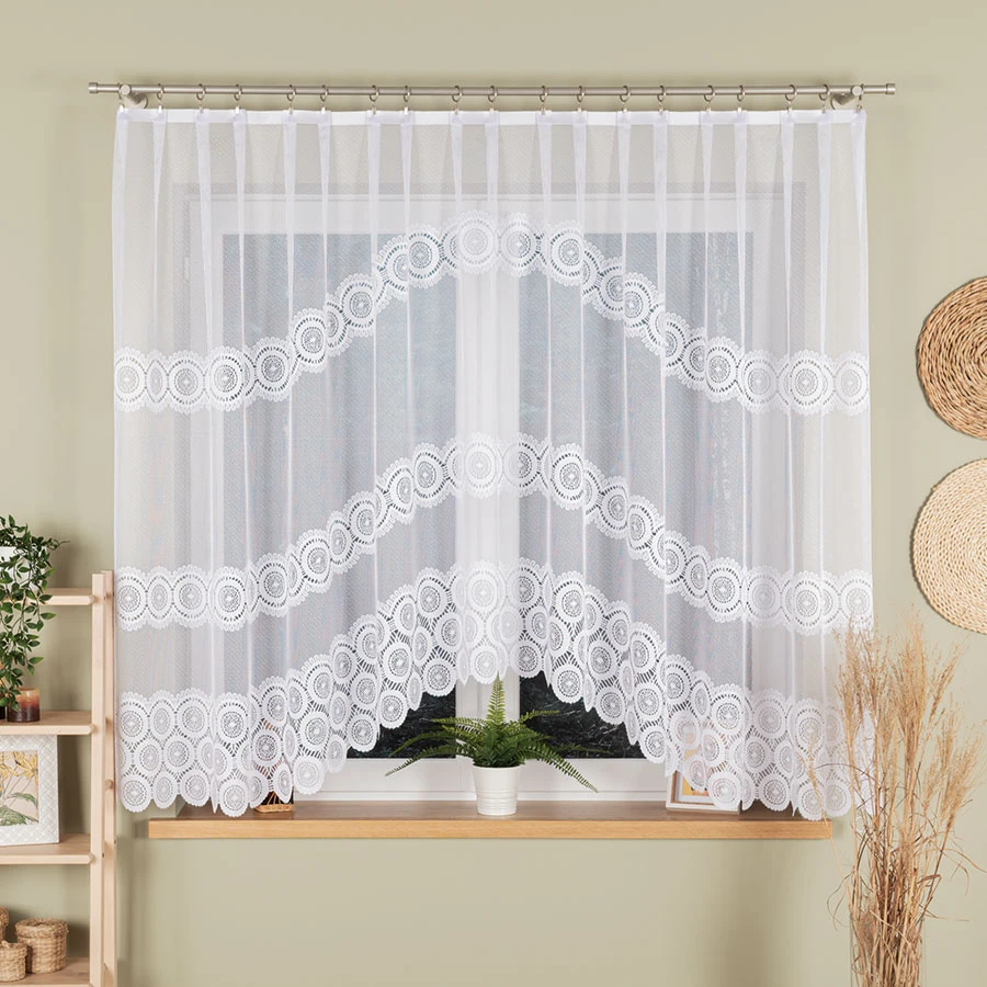 - Ozdobne podcięcie – dolna krawędź wycięta w dekoracyjny sposób podkreśla elegancję firanki.