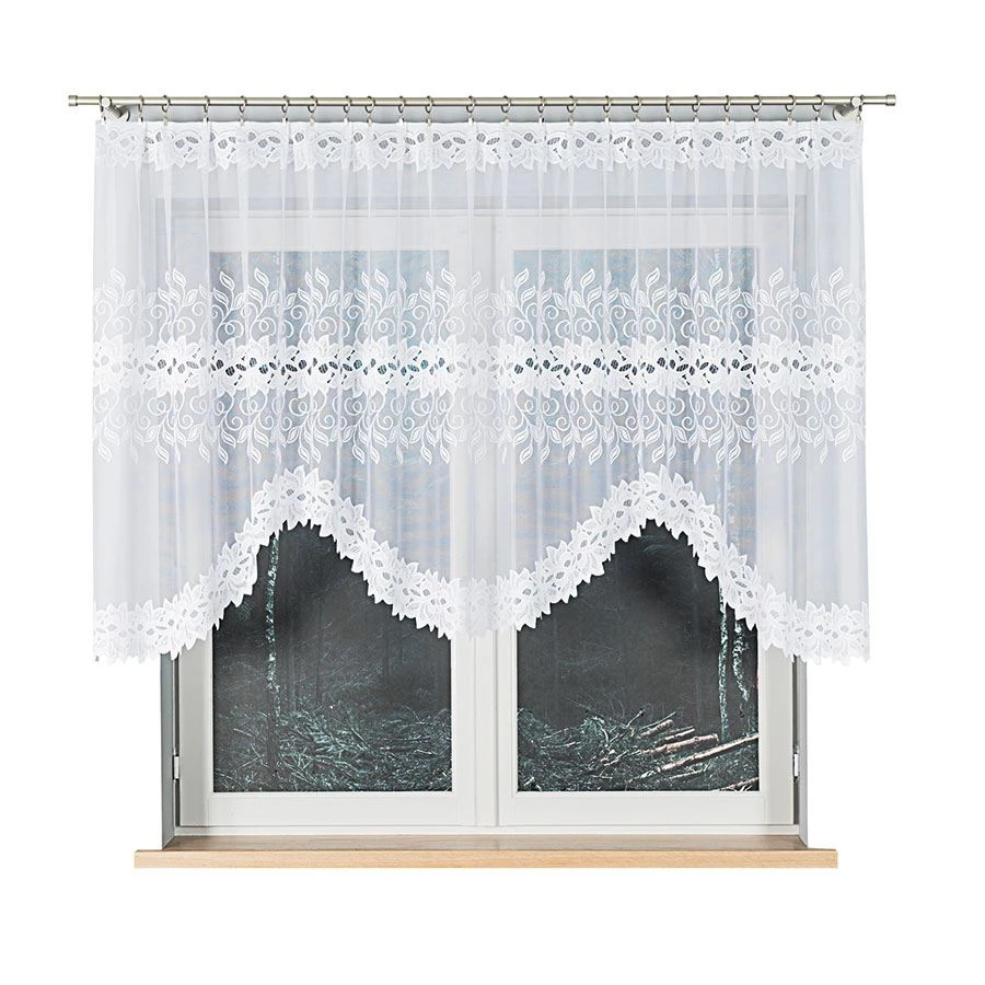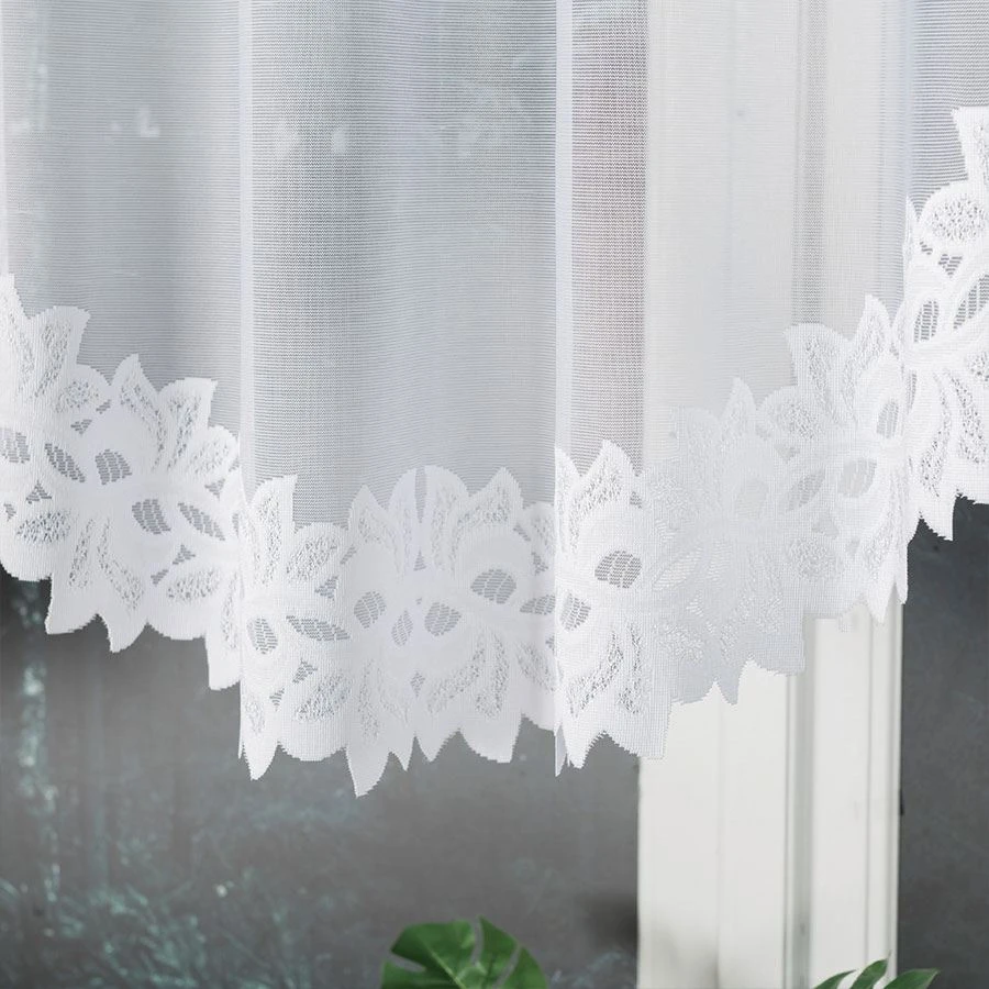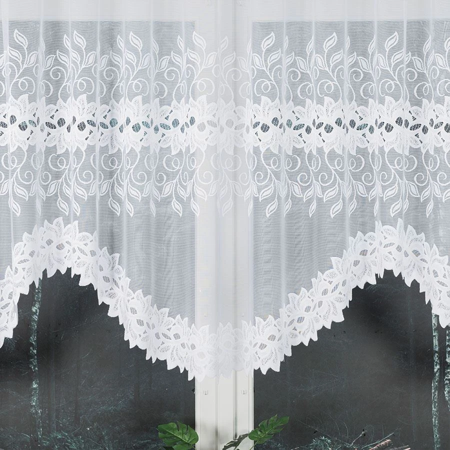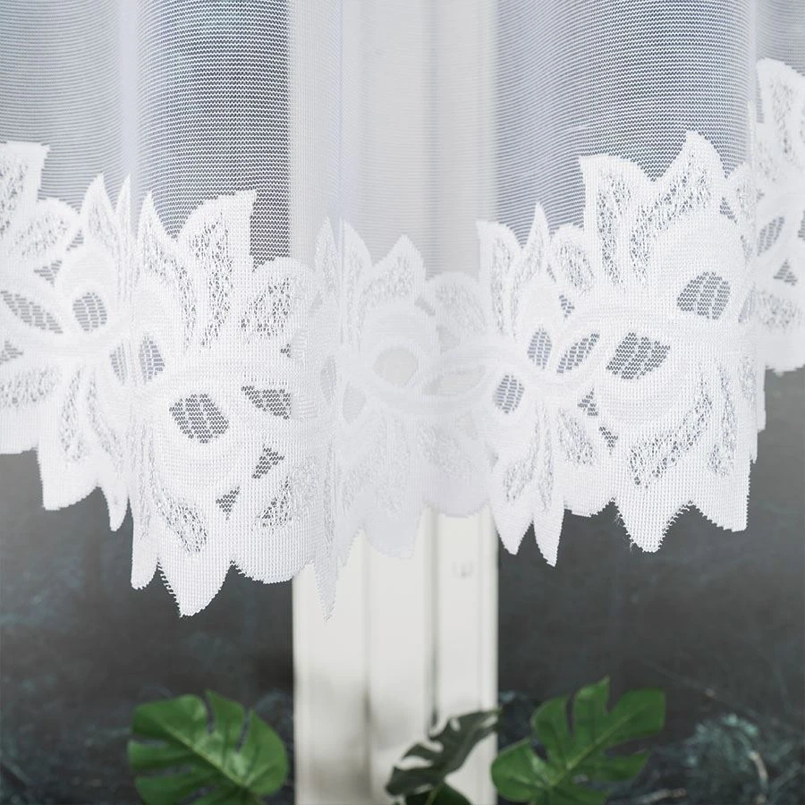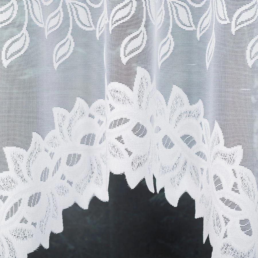 Biała tkanina pięknie przepuszcza światło, dzięki czemu pomieszczenie pozostaje jasne i przytulne. Ażurowa struktura z motywem liści sprawia, że firanka wygląda delikatnie i świeżo, a jednocześnie stanowi gustowną osłonę okna. Ozdobne wycięcie w dolnej części tworzy miękką, falującą linię, która podkreśla charakter aranżacji i wprowadza wrażenie lekkości.