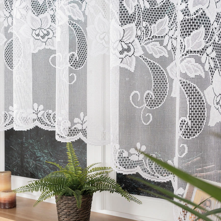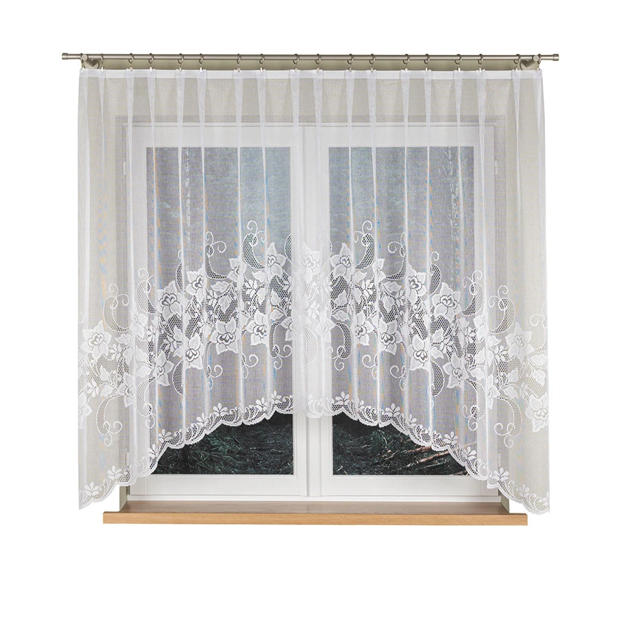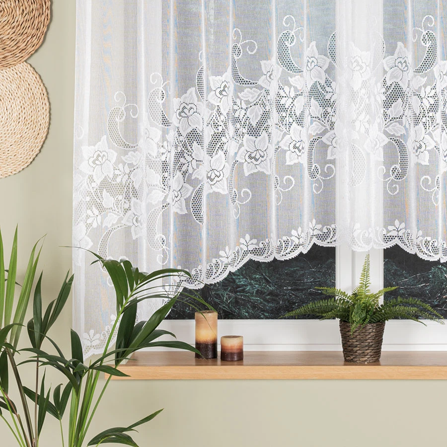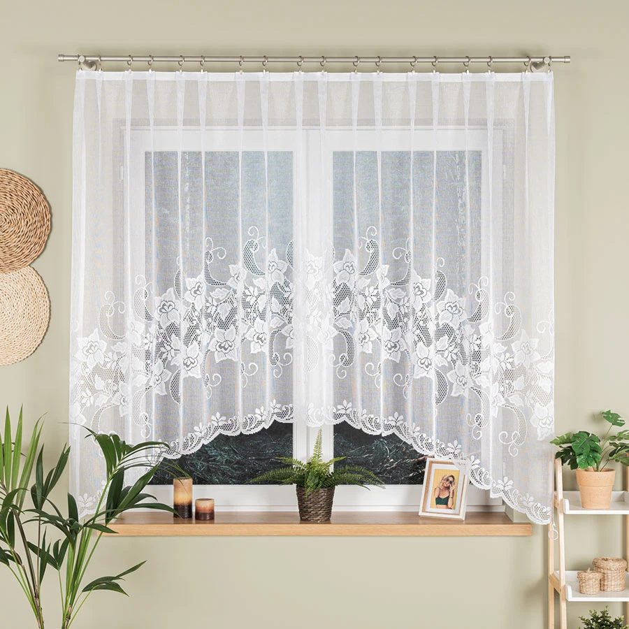 Firanka JANINA 410x160 cm to propozycja dla tych, którzy cenią klasyczne wzory w nieco bardziej wyrazistej odsłonie. Wykonana z białego żakardu, przyciąga wzrok bogatym, kwiatowym motywem, który prezentuje się bardzo dekoracyjnie, ale wciąż lekko i elegancko. ✨🌿 Dolna krawędź została ozdobiona podcięciem, które układa się w efektowną falę – ten delikatny detal sprawia, że firanka pięknie prezentuje się na oknie, nadając wnętrzu miękkości i rytmu. 🪟 Szerokość 410 cm sprawia, że model JANINA doskonale pasuje na karnisz o długości **205–270 cm**, tworząc eleganckie, gęste marszczenie w proporcji 1:2 do 1:1,5. Gotowa do zawieszenia na żabki – bez tunelu i bez potrzeby dodatkowych prac. 🧷