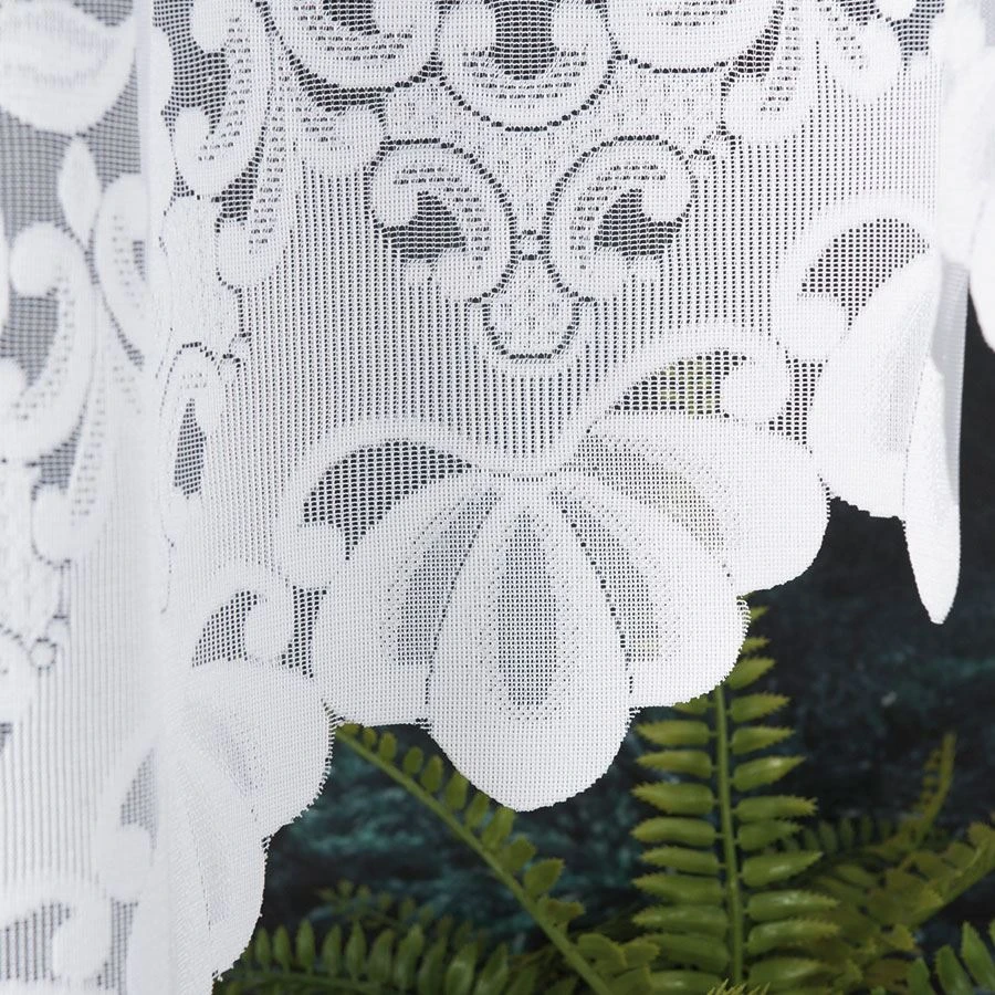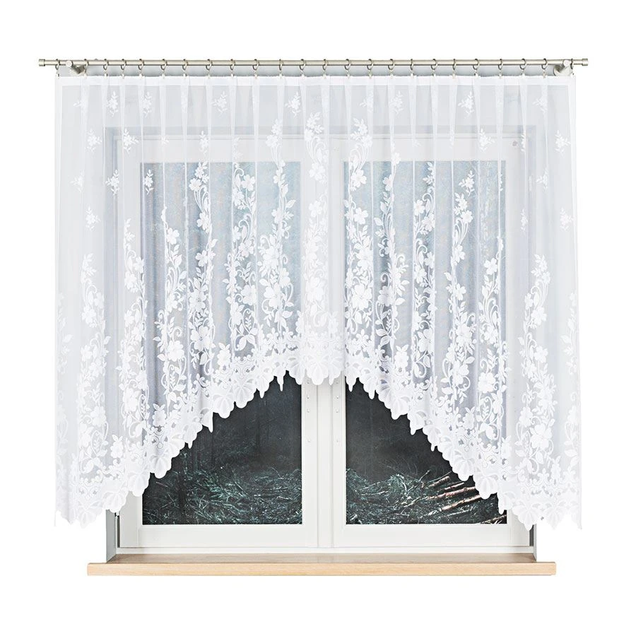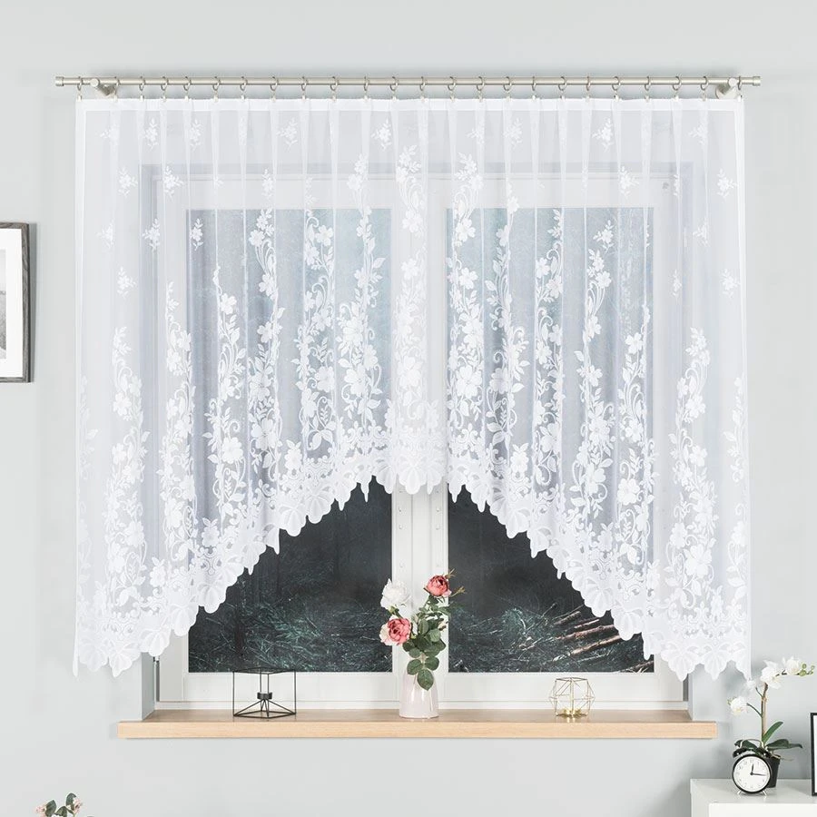 Firanka wykonana jest z białego, półprzezroczystego żakardu, który pięknie rozprasza światło dzienne. Gęsty motyw florystyczny przyciąga uwagę i tworzy ciepły, domowy klimat, a dekoracyjne podcięcie podkreśla charakter wnętrza.
