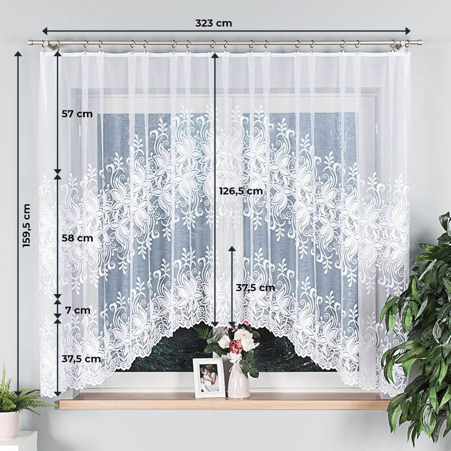 JOANNA to firanka w rozmiarze 300x160 cm, która zachwyca bogatym, ażurowym wzorem kwiatowym i delikatnym, dekoracyjnym podcięciem. Wykonana z wysokiej jakości białego żakardu, pięknie się układa i optycznie rozświetla przestrzeń. To doskonały wybór do salonu, jadalni, kuchni czy sypialni, gdzie chcesz wprowadzić romantyczny, świeży i elegancki akcent.