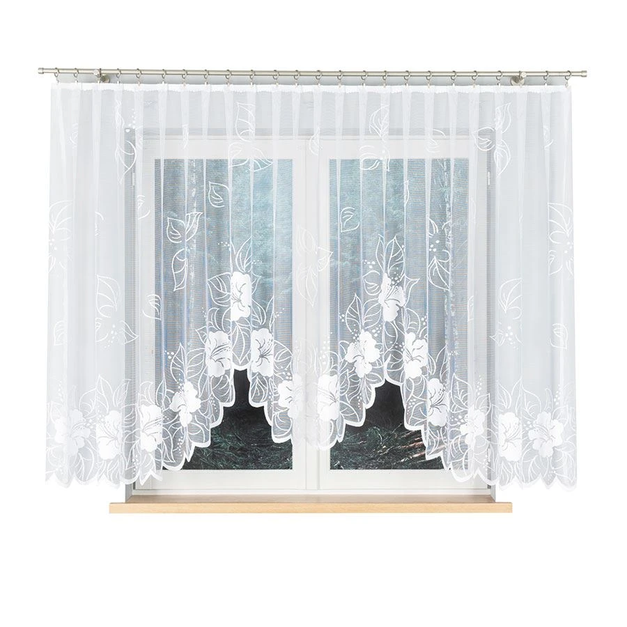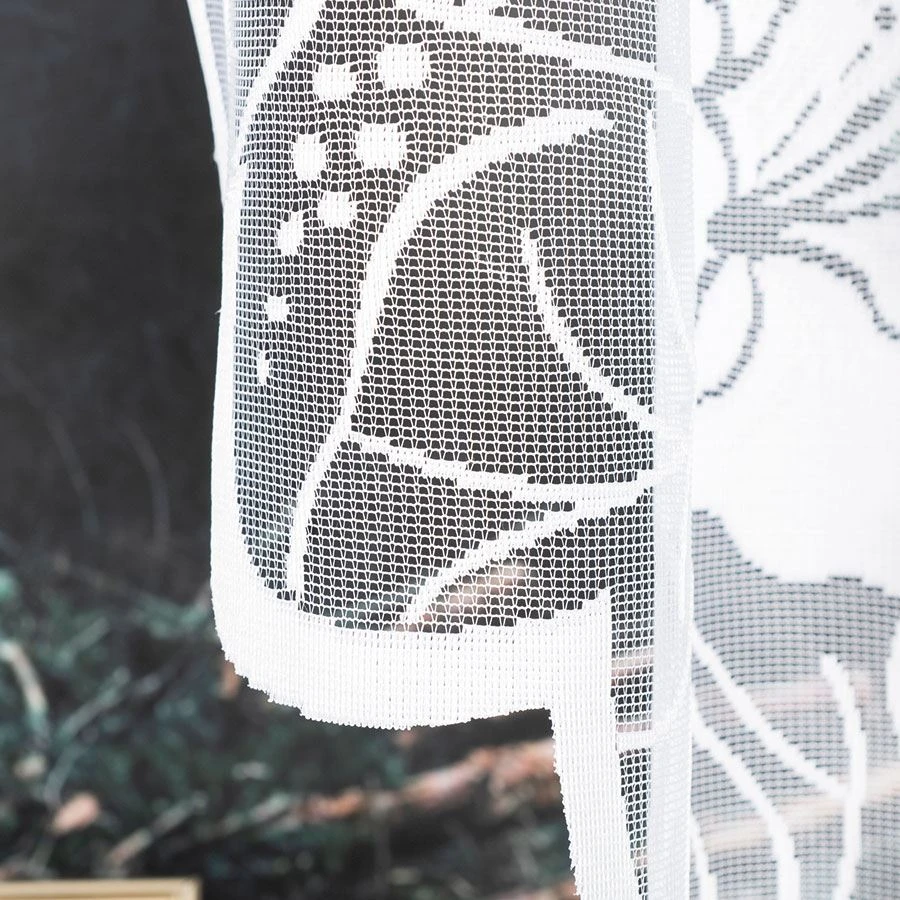 Ten rozmiar będzie dobrym wyborem do salonu, sypialni, jadalni lub pokoju gościnnego – szczególnie na szersze okna. Delikatny wzór kwiatów i biała kolorystyka pozwalają łatwo połączyć firankę z zasłonami oraz innymi tekstyliami, zachowując spójny, jasny wystrój.
