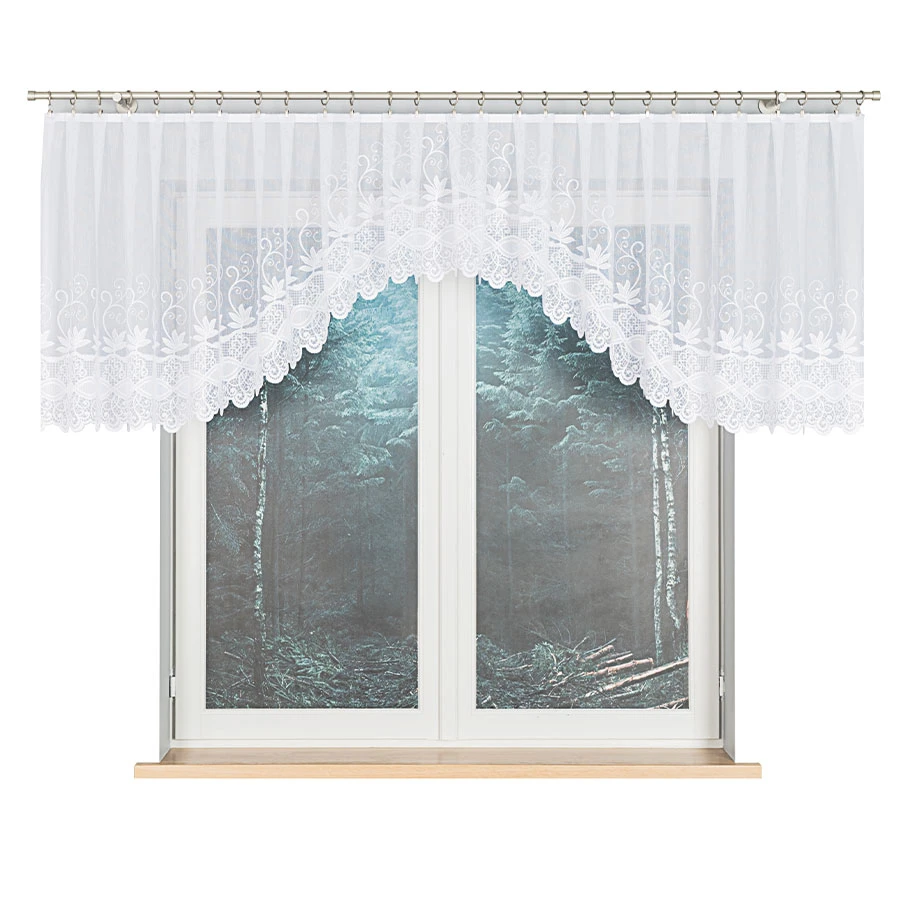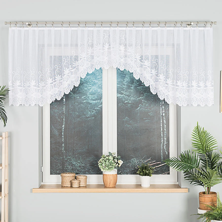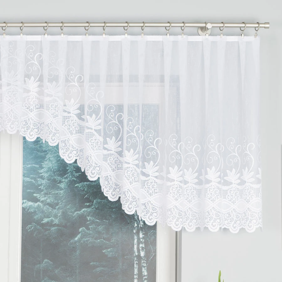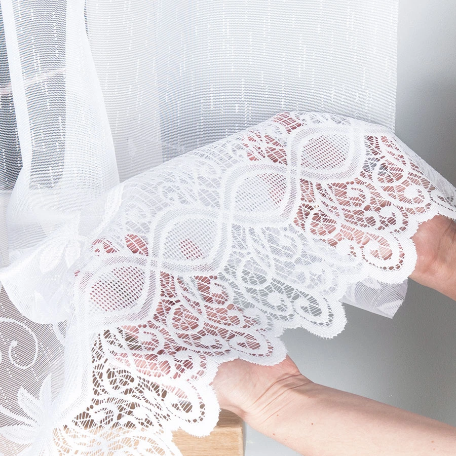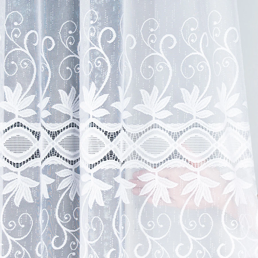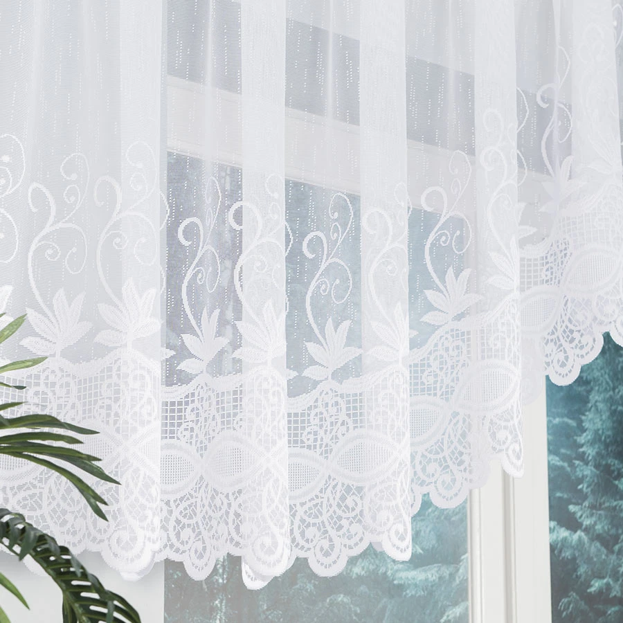 Model JOWITA w rozmiarze 400x80 cm to doskonała propozycja dla tych, którzy szukają firanki do wyjątkowo szerokiego okna. Dzięki dużej szerokości pięknie układa się w miękkie fale, tworząc estetyczne marszczenie i zapewniając spójny efekt dekoracyjny na całej długości. Firanka wykonana jest z lekkiego, białego żakardu z klasycznym wzorem liści i kwiatów, przechodzącym w ozdobną, koronkową dolną krawędź.