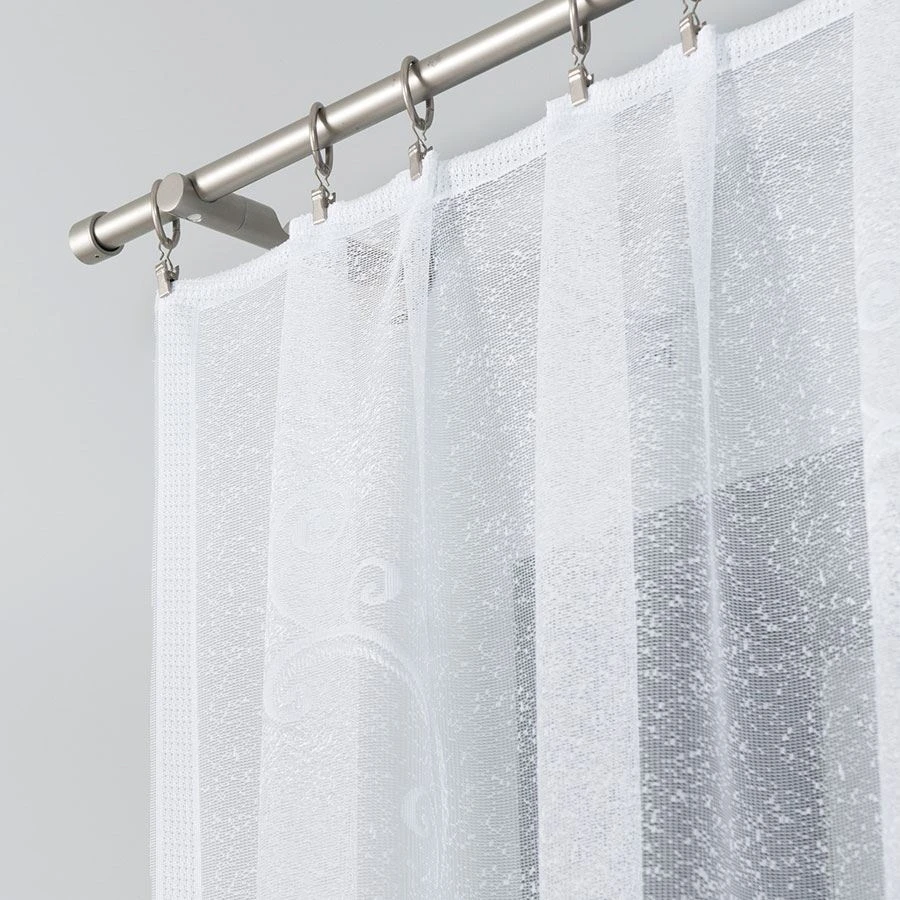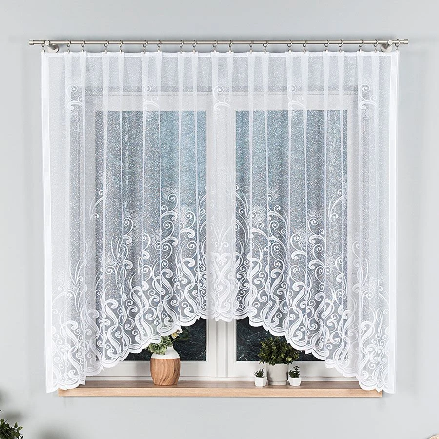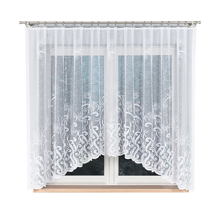 Firanka żakardowa WANDA w rozmiarze 300x160 cm to gotowa dekoracja, która łączy ponadczasową klasykę z delikatnym wzornictwem. Wykonana z białego żakardu wysokiej jakości, zachwyca eleganckim motywem roślinnym, który dodaje lekkości i subtelności. Charakterystyczne podcięcie na dole ułożone na skos tworzy miękką linię, dzięki której firanka prezentuje się niezwykle efektownie i dynamicznie.
