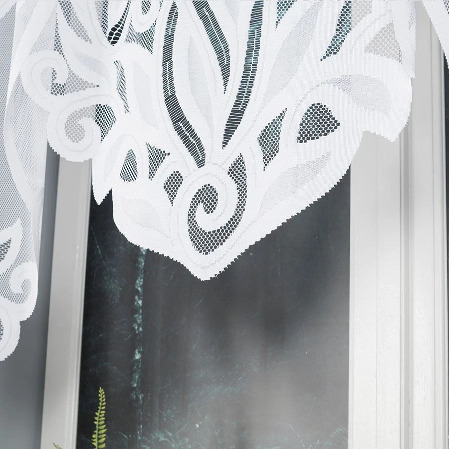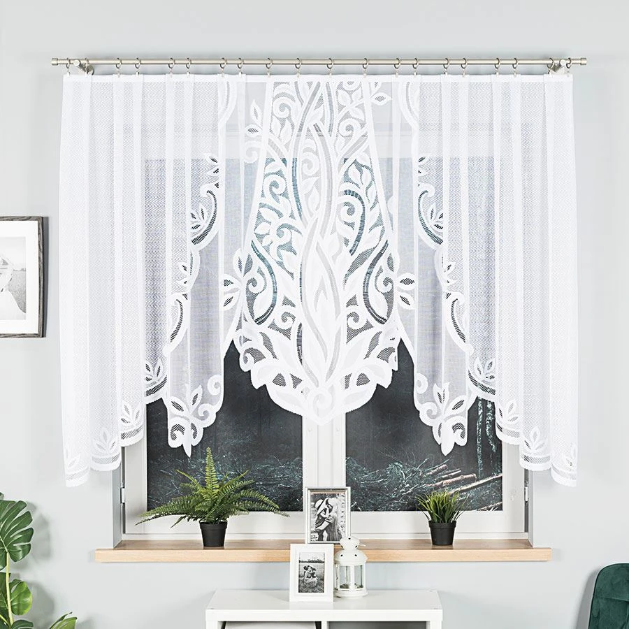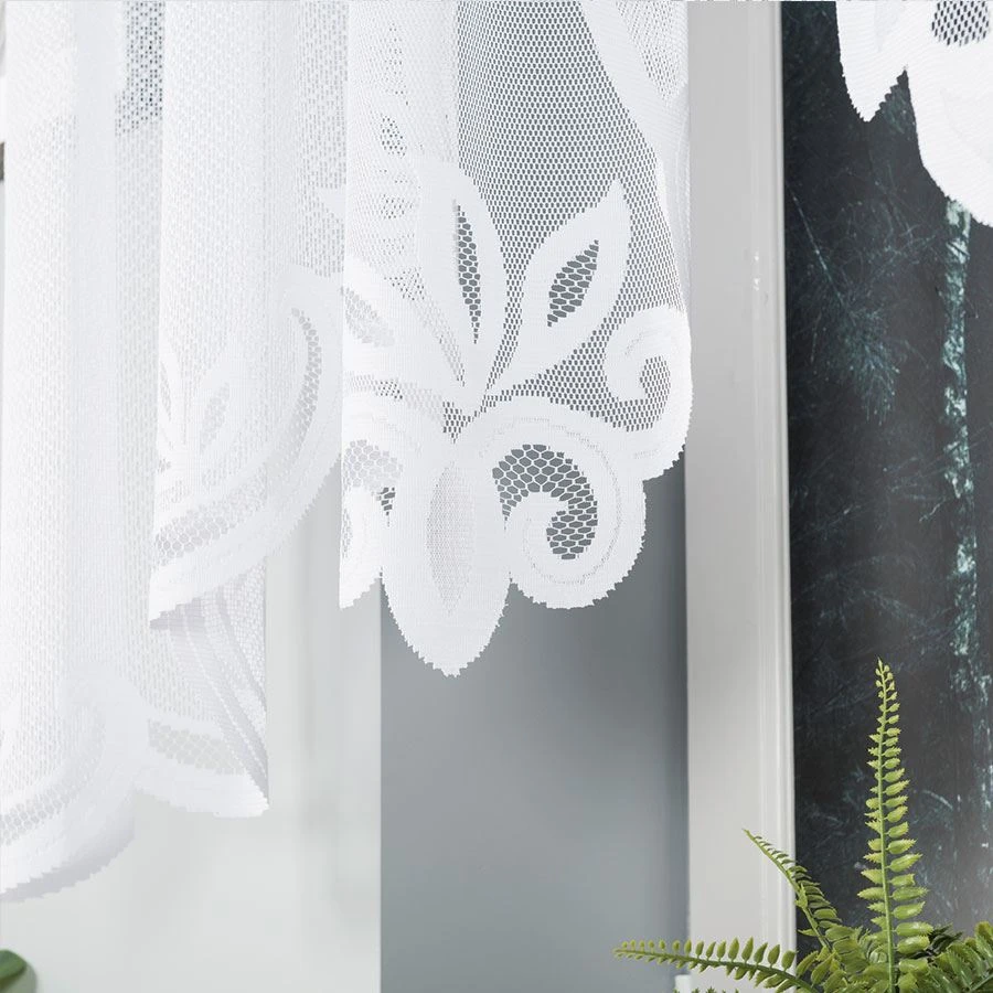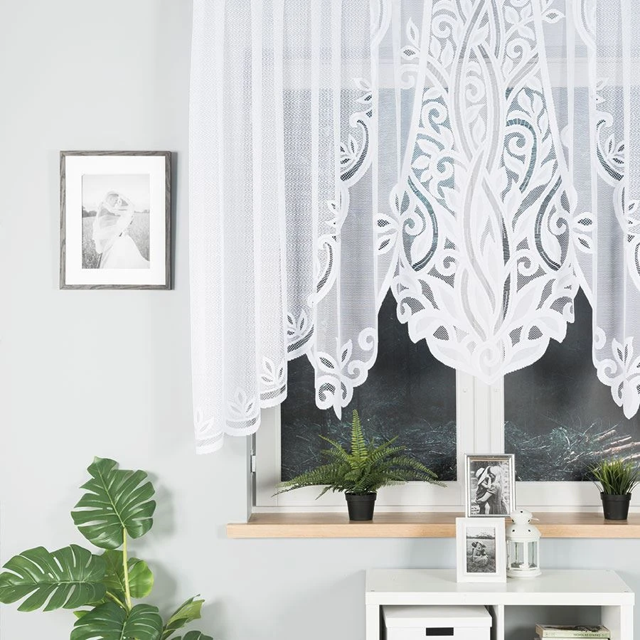 Model wyróżnia się imponującym centralnym wzorem liści oraz ozdobnym podcięciem w kształcie wydłużonego łuku, które pięknie eksponuje parapet. Ażurowa struktura materiału dodaje przestronności i naturalnego charakteru wnętrzom.