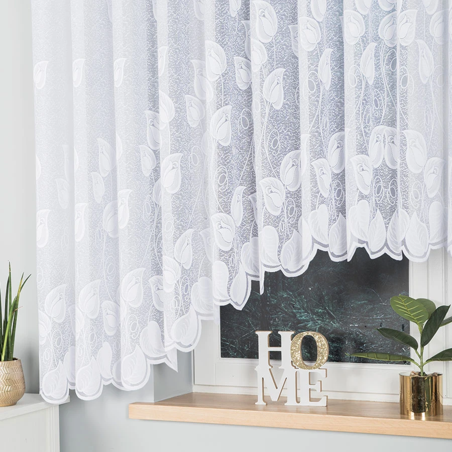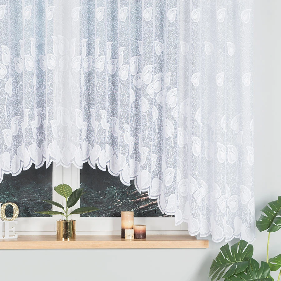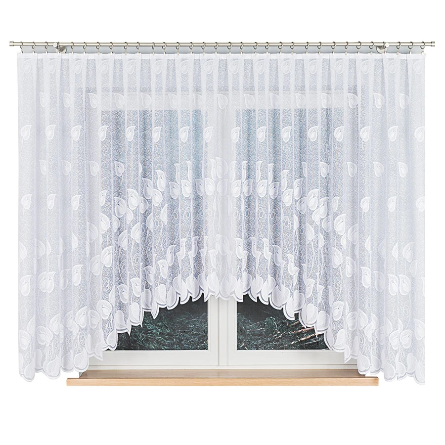 NORA w wymiarze 400x160 cm to gotowa firanka żakardowa o roślinnym wzorze i dekoracyjnym podcięciu w falę. Idealnie prezentuje się po zmarszczeniu na szerokości około 200 cm, co sprawia, że doskonale pasuje na większe okna w salonie, jadalni czy przestronnej kuchni.