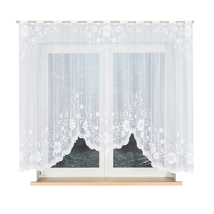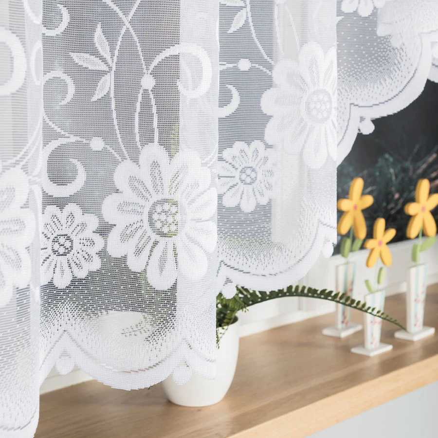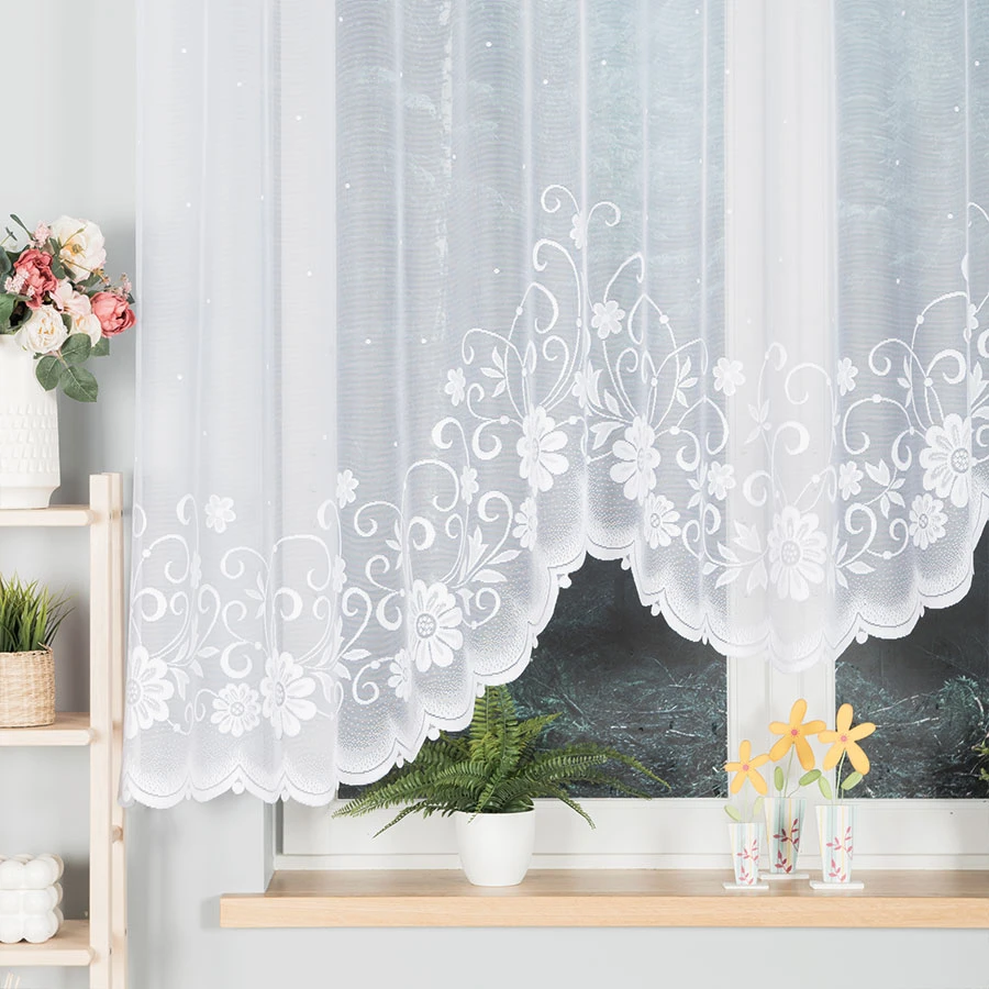 - Ozdobne podcięcie – dekoracyjne wykończenie dolnej krawędzi podkreśla elegancki charakter firanki.
