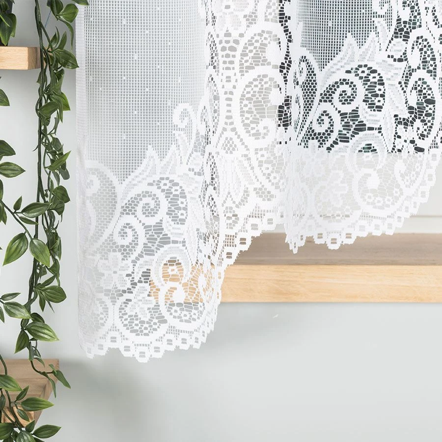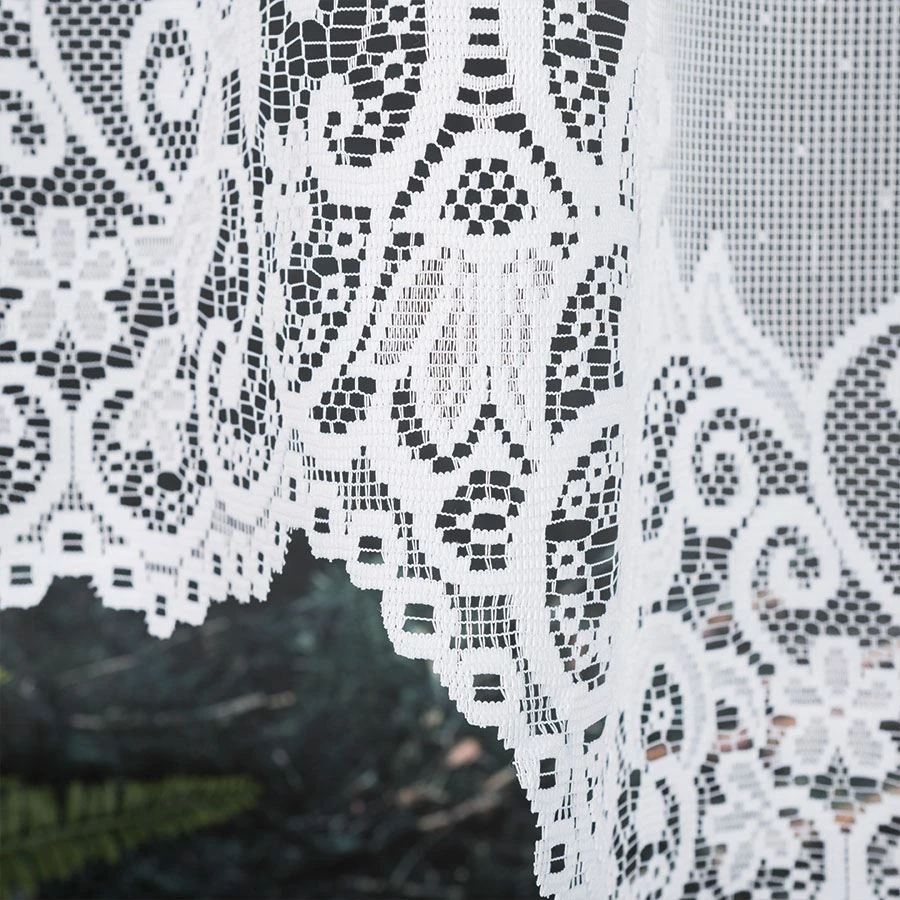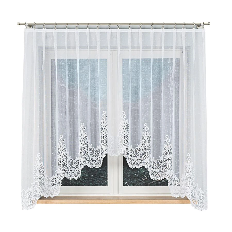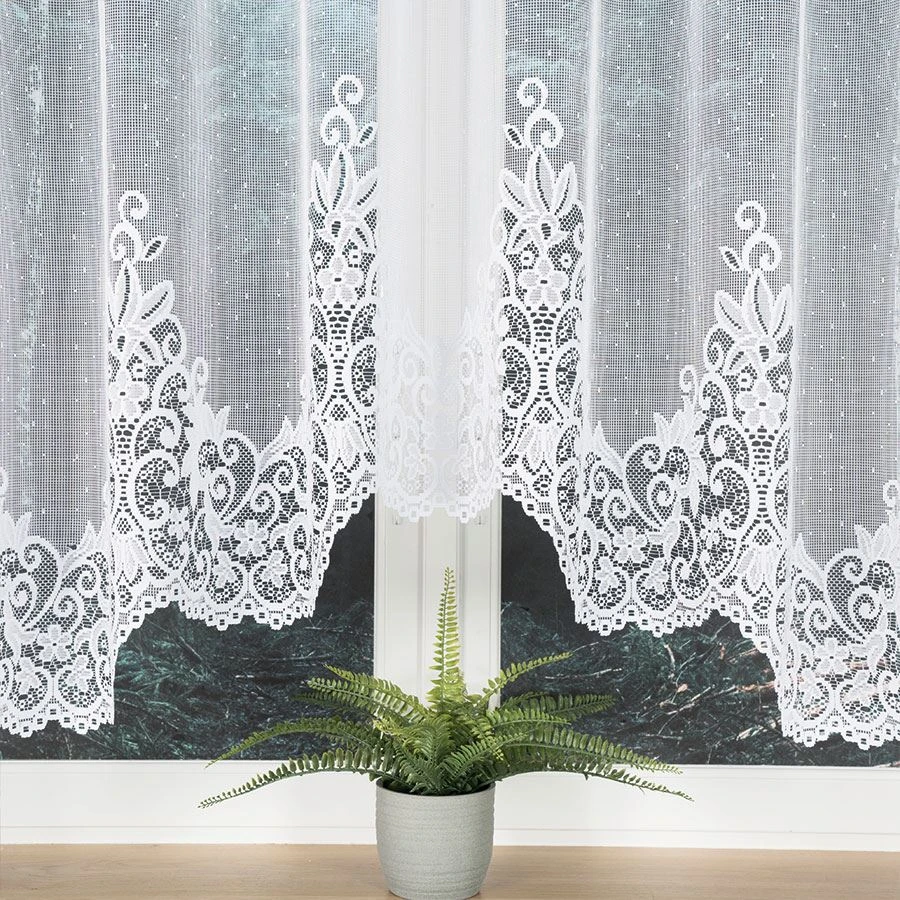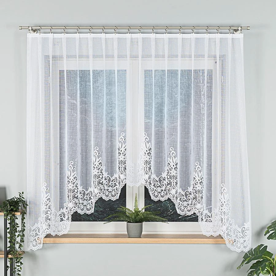 Gotowa firanka żakardowa BERENIKA o wymiarach 330x170 cm to elegancka propozycja dla tych, którzy chcą wprowadzić do swojego domu subtelny urok i klasyczny styl. Biały żakardowy materiał, ozdobiony delikatnymi florystycznymi wzorami i efektownym podcięciem na dole, pięknie zdobi okno, a jednocześnie pozwala na swobodne przenikanie światła, tworząc w pomieszczeniu ciepły, przytulny klimat.
