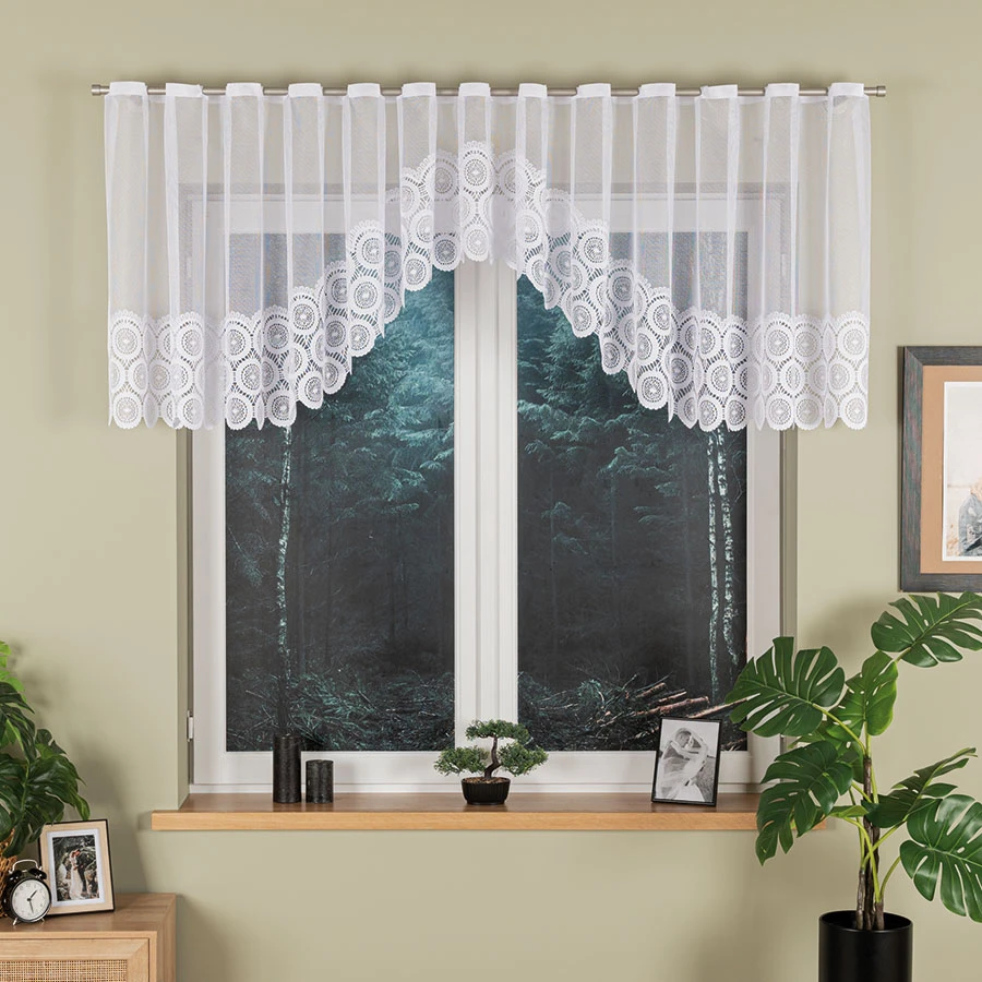 MALWINA w rozmiarze 410x80 cm to firanka gotowa, która doskonale łączy subtelną estetykę z funkcjonalnością. Zdobiona eleganckim, ażurowym pasem przy dolnej krawędzi i podcięciem w kształcie łuku, świetnie sprawdzi się w kuchni, jadalni czy salonie. Dzięki szlufkom umieszczonym w górnej części można ją wygodnie zawiesić bez żabek – wystarczy przeciągnąć karnisz przez otwory.