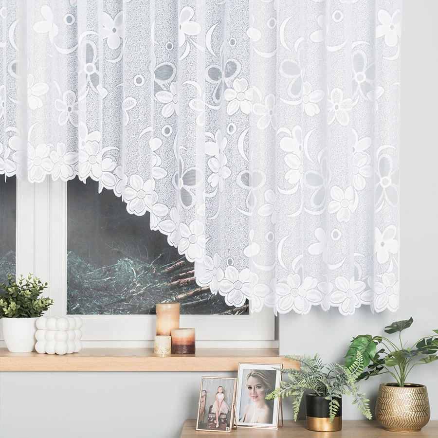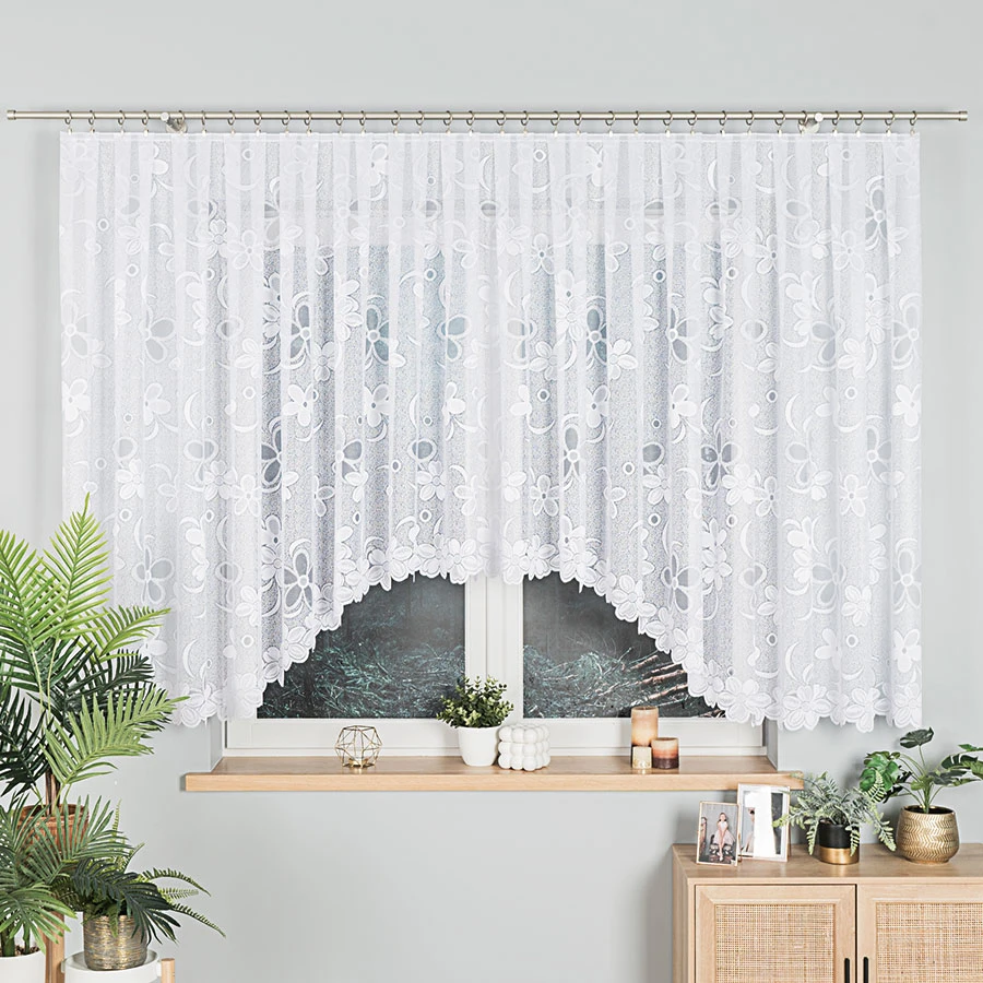 Wykonana z białego żakardu, firanka subtelnie przepuszcza światło, wprowadzając do wnętrza jasność, świeżość i przestrzeń. Centralny pas zdobi kwiatowy motyw – wyraźny, ale delikatny, utrzymany w ponadczasowej stylistyce 🌼