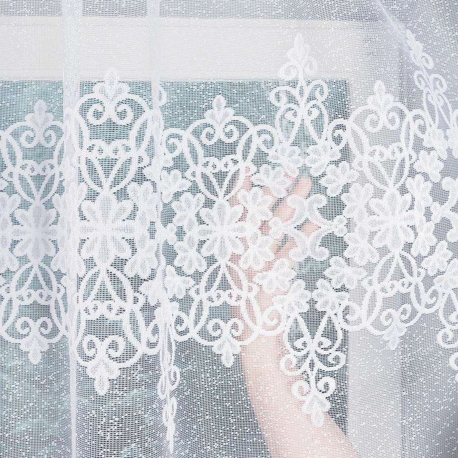 Szukasz firanki, która pięknie ozdobi większe okno, nie przytłaczając przy tym wnętrza? Firanka ŻANETA 450x155 cm łączy w sobie delikatność i klasę w wersji stworzonej z myślą o szerszych karniszach. Jej subtelny, koronkowy wzór w białym żakardzie przyciąga wzrok i wprowadza do pomieszczenia lekkość i romantyczną atmosferę. ✨🌿 Dolna krawędź zakończona jest efektownym podcięciem, które tworzy falę i dodaje całej firance eleganckiego charakteru. Ażurowa struktura pięknie rozprasza światło, nie blokując go, dzięki czemu wnętrze pozostaje jasne i przytulne. ☀️ Dzięki szerokości 450 cm, firanka idealnie układa się na karniszu o długości **225–300 cm**, zapewniając efektowne marszczenie w proporcji od 1:2 do 1:1,5. Gotowa do zawieszenia na żabki – bez tunelu, bez przeróbek. 🧷