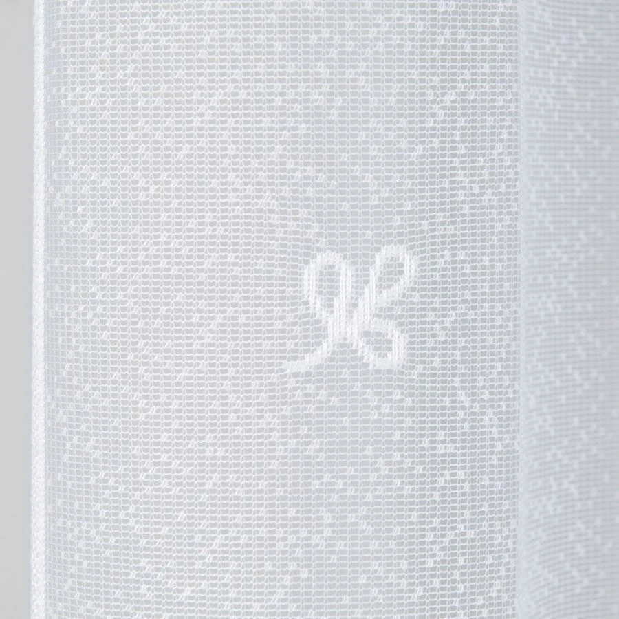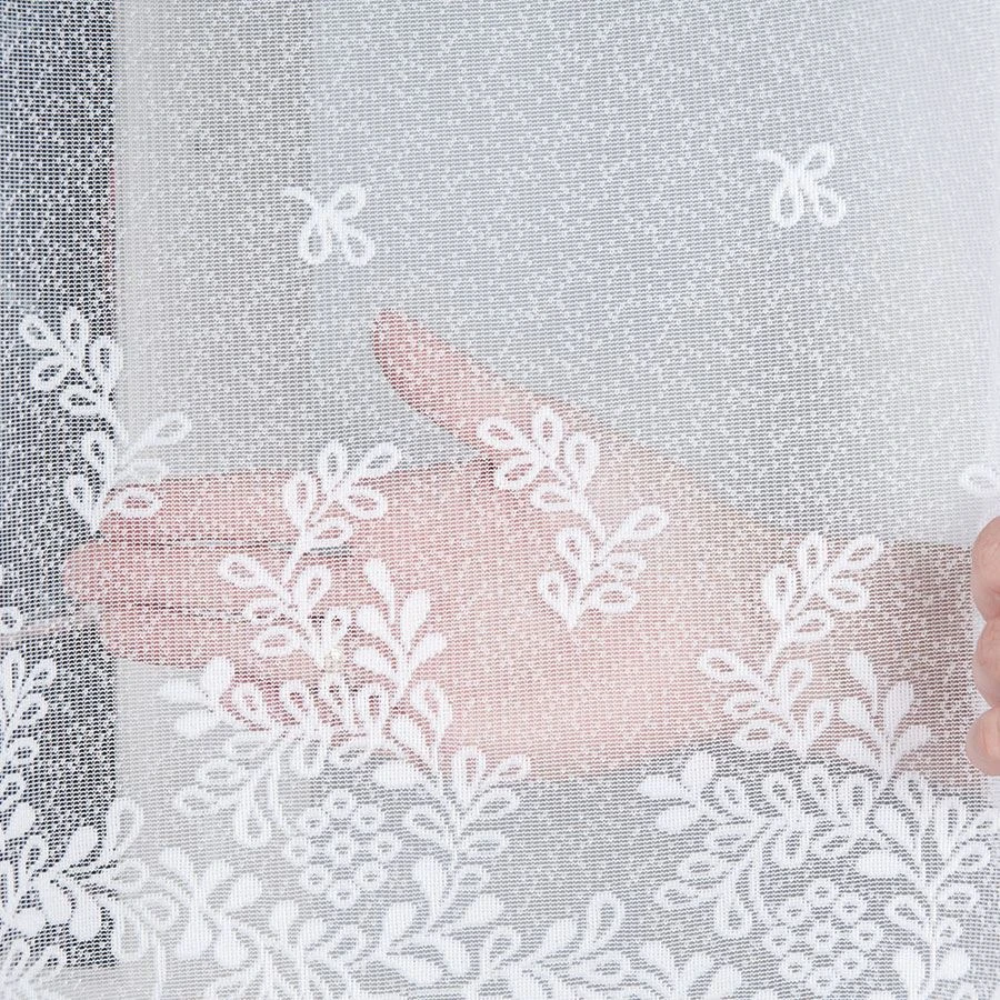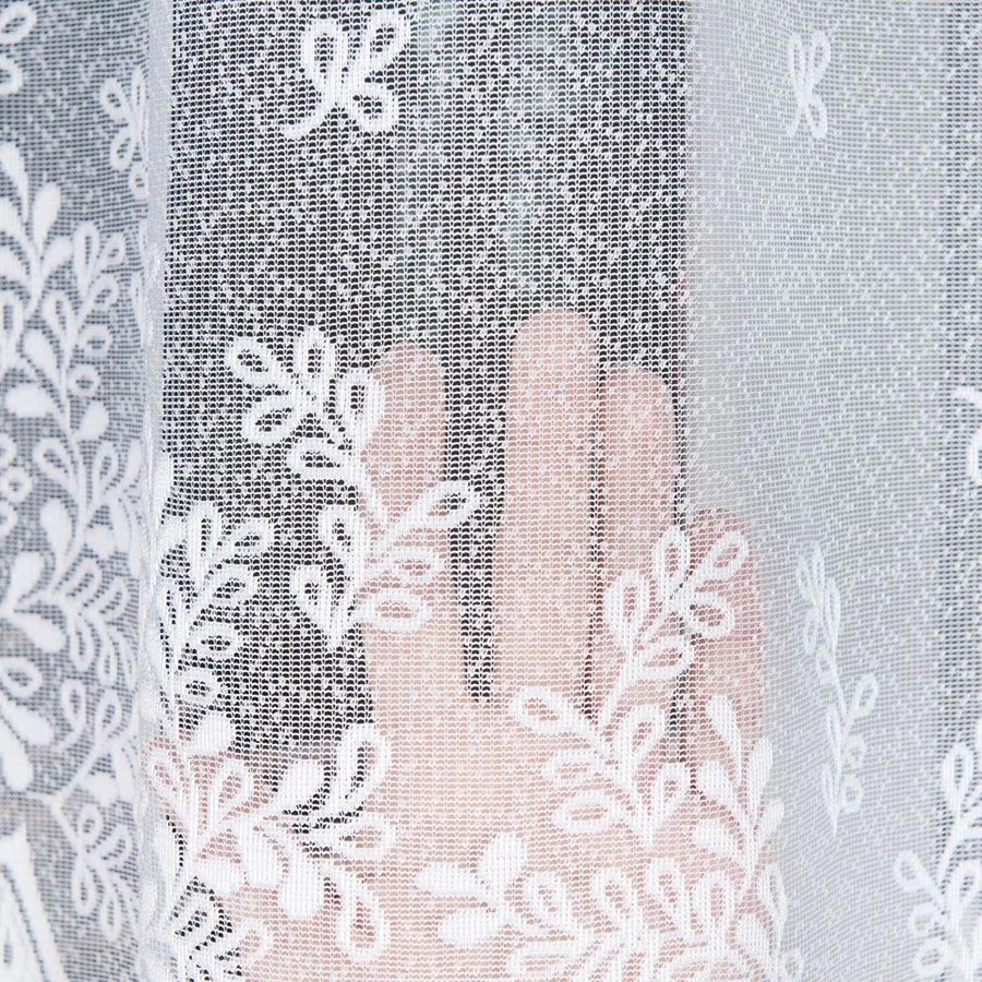 Tkanina została wykonana z białego żakardu o lekkiej, półtransparentnej strukturze. W dolnej części firanki znajduje się gęsty wzór kwiatowy 🌿, który stopniowo zanika ku górze, tworząc harmonijne i eleganckie przejście. To detal, który wnosi do wnętrza naturalny urok i ponadczasowy styl.