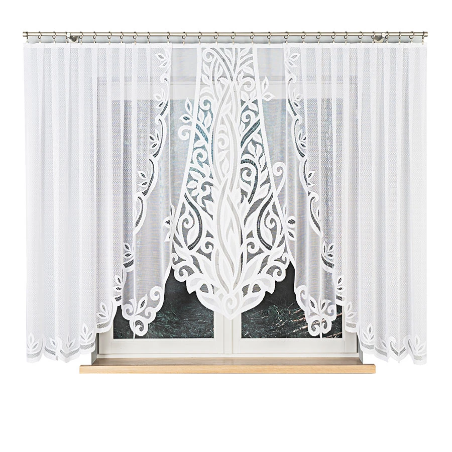 Wyróżnia się okazałym wzorem liści, który biegnie przez całą wysokość i centralnie tworzy efektowne podcięcie w kształcie łuku. Dzięki temu światło wpadające przez firankę tworzy ciekawe refleksy, a całość wygląda niezwykle lekko i elegancko ✨