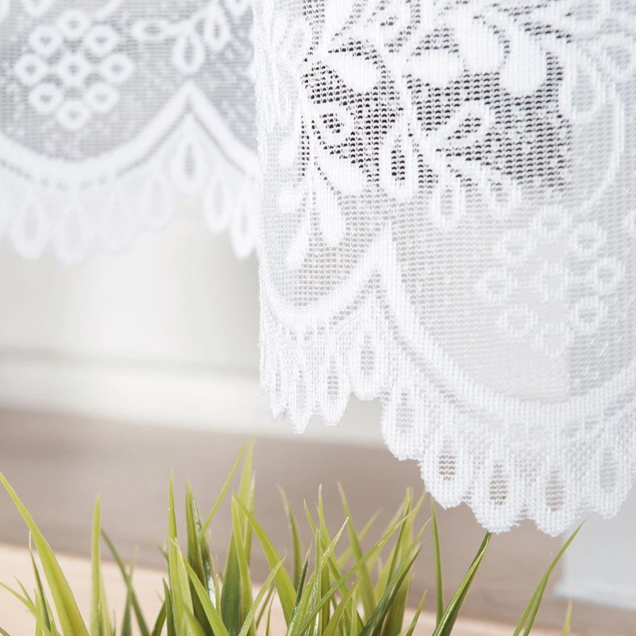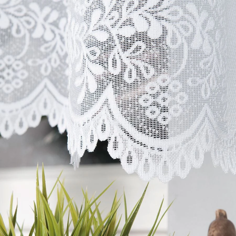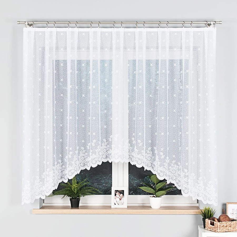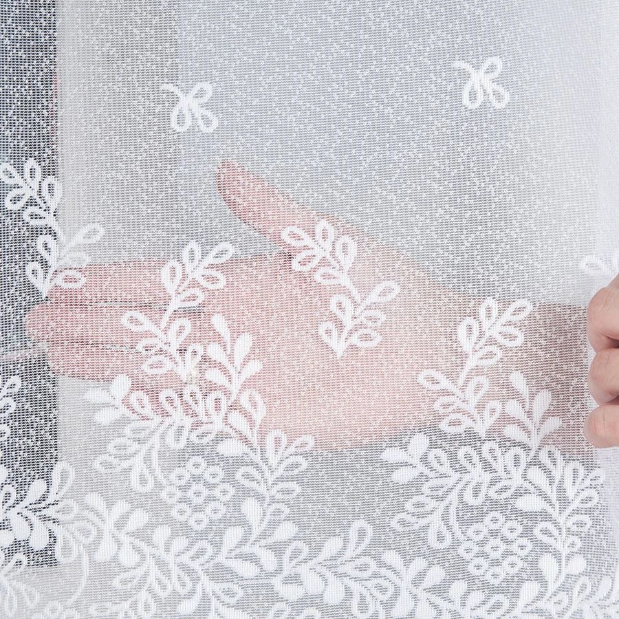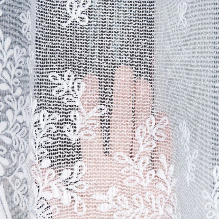 Uszyta z białego żakardu, firanka zdobiona jest delikatnym, kwiatowym wzorem 🌿, który stopniowo zagęszcza się ku dołowi, tworząc estetyczny, naturalny efekt. Lekka siateczka w górnej części tkaniny pozwala światłu swobodnie przenikać, wprowadzając do wnętrza jasność i świeżość.