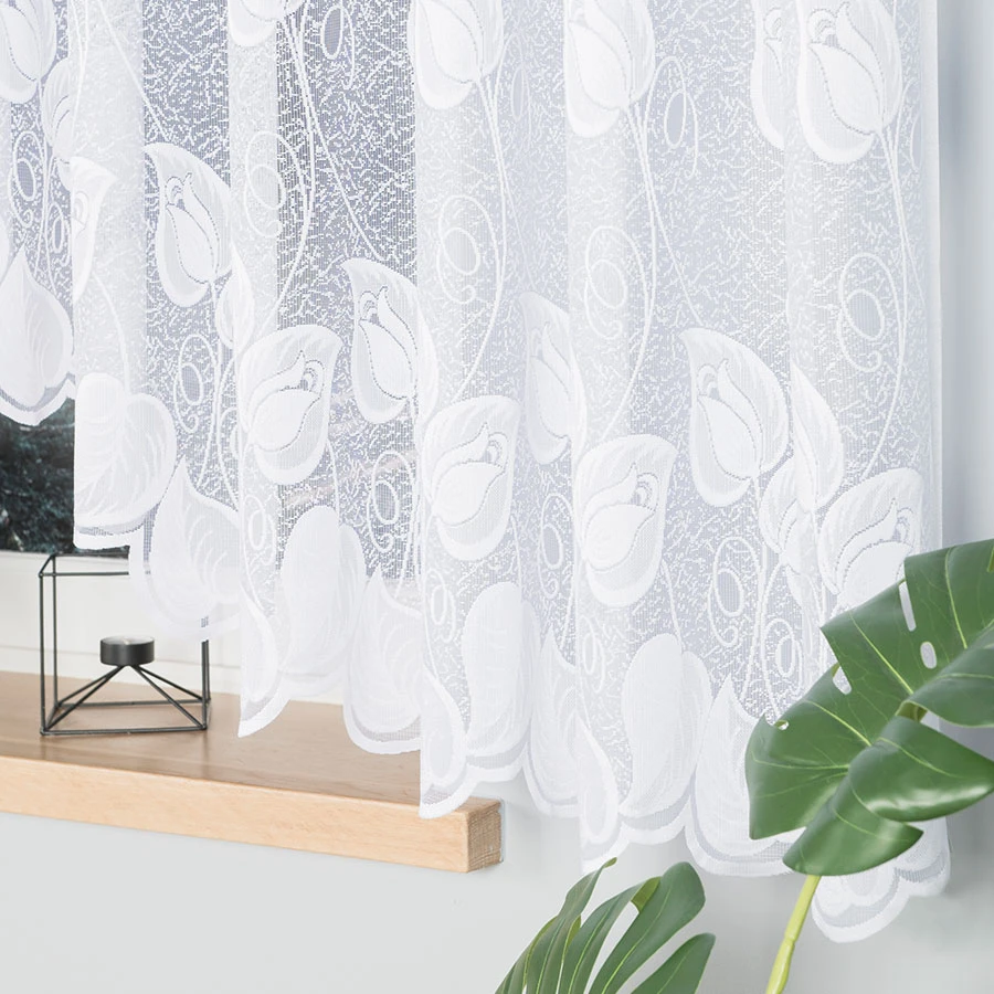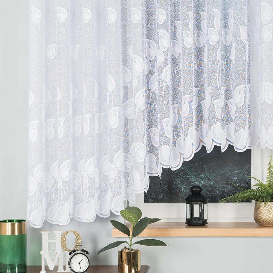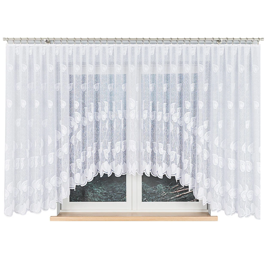 NORA w rozmiarze 600x160 cm to gotowa firanka żakardowa stworzona z myślą o najszerszych przeszkleniach. Piękny wzór liści rozciągający się na całej szerokości oraz ozdobne podcięcie w łagodny łuk tworzą dekorację, która przyciąga wzrok, ale nie dominuje przestrzeni.