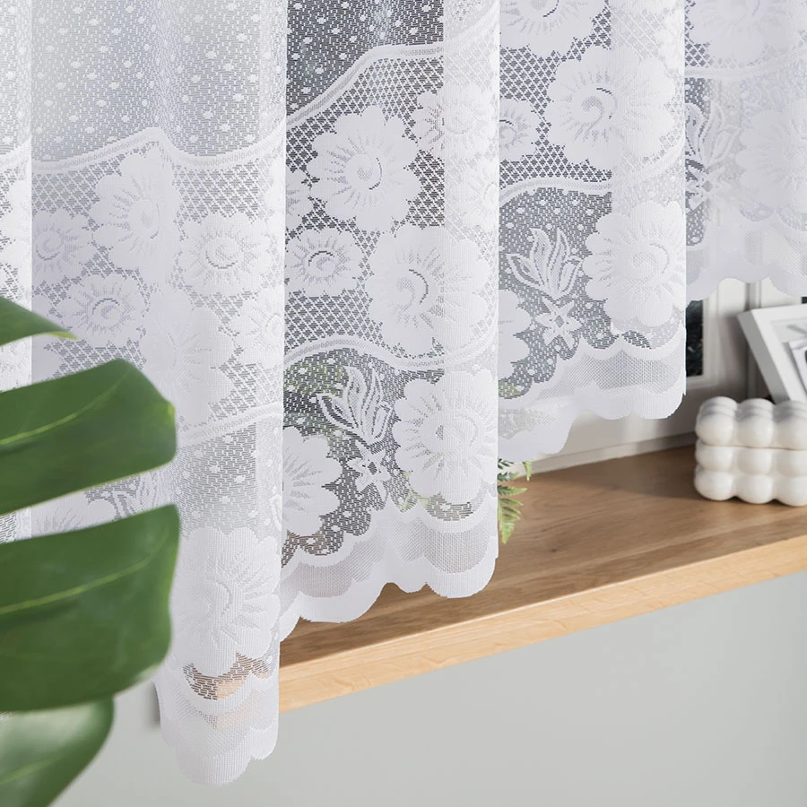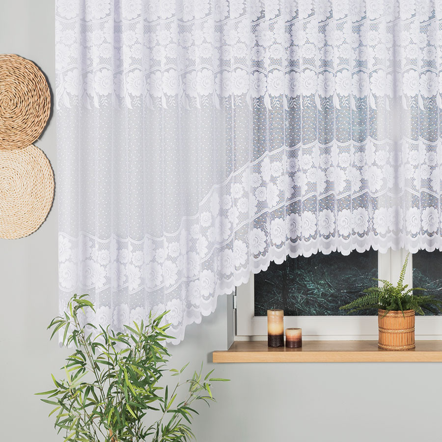 Wykonana z wysokiej jakości białego żakardu, firanka prezentuje bogaty, a zarazem subtelny wzór kwiatowy, ułożony w poziome pasy. To właśnie te detale sprawiają, że całość wygląda elegancko, ale bez przesady – doskonale wpisuje się w przytulne, rodzinne wnętrza, jak i bardziej klasyczne aranżacje.