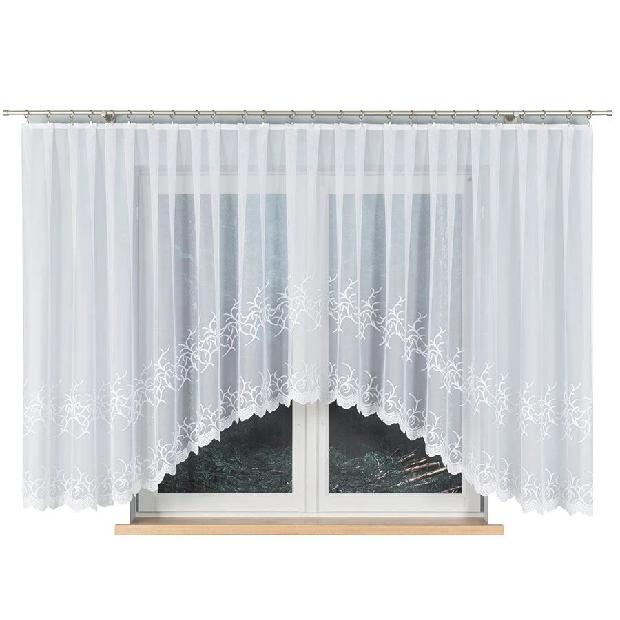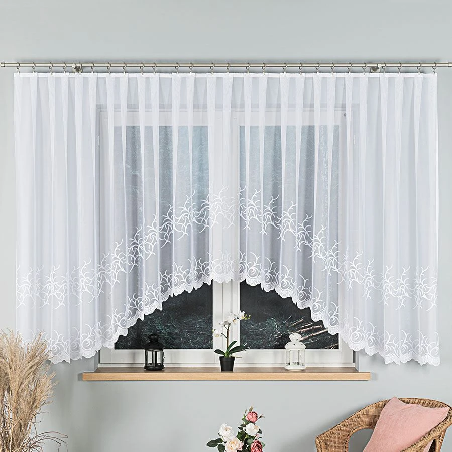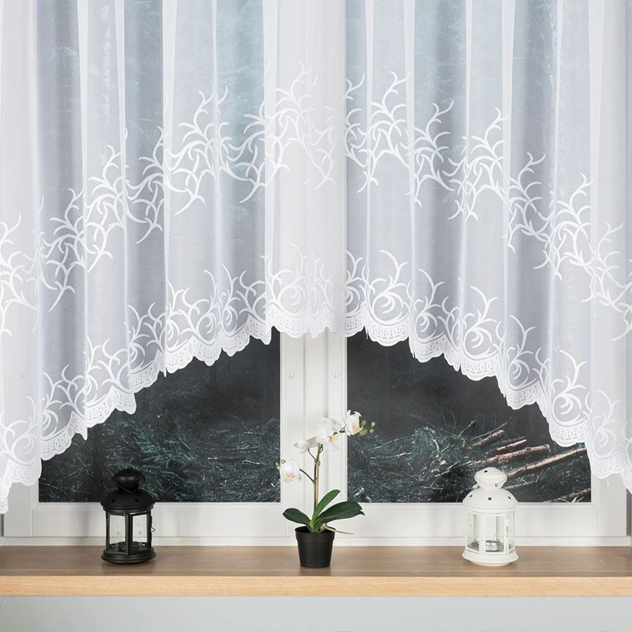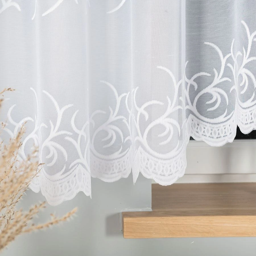 Firanka została wykonana z wysokiej jakości białego żakardu, który lekko przepuszcza światło, tworząc w pomieszczeniu przyjemny, jasny klimat. Wzór delikatnych gałązek rozmieszczony jest na całej powierzchni materiału, dzięki czemu dekoracja wygląda spójnie, niezależnie od sposobu marszczenia.