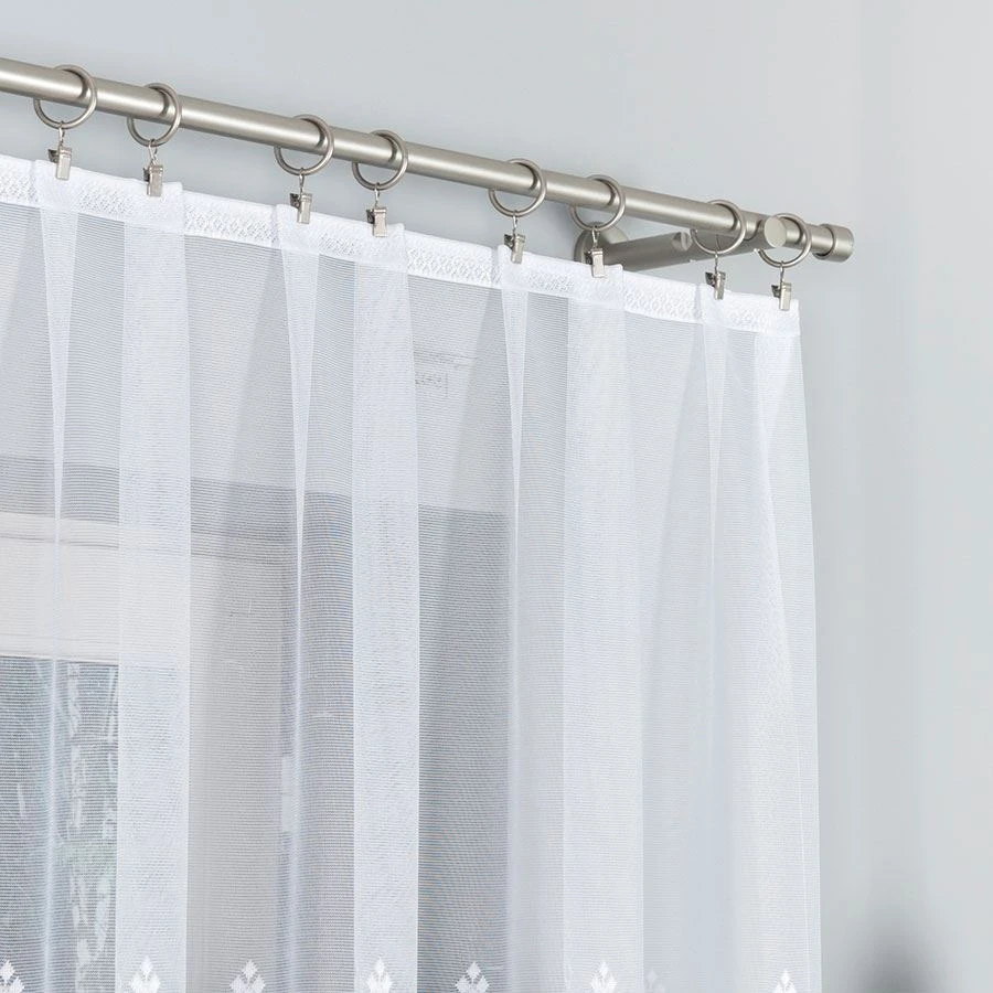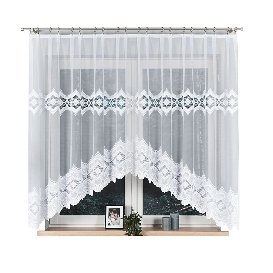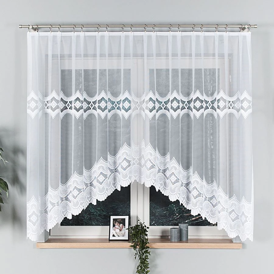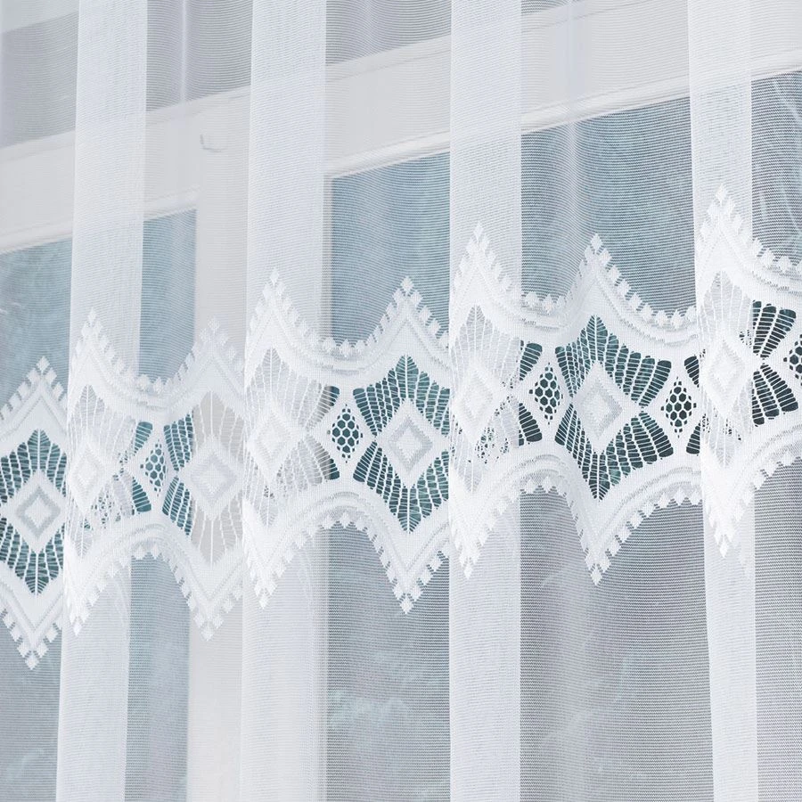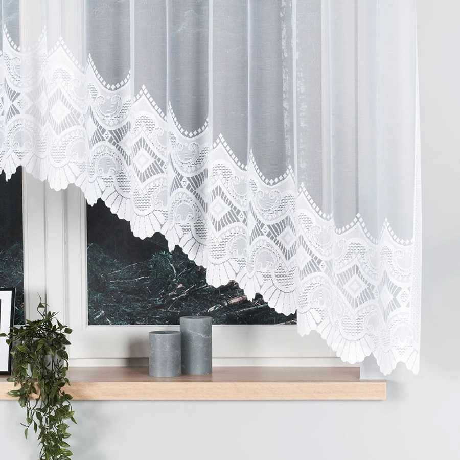 LUCYNA to gotowa firanka żakardowa o wymiarach 310x160 cm, która świetnie sprawdzi się na większych oknach w salonie, sypialni lub jadalni. Biały materiał ozdobiony dekoracyjnym wzorem geometryczno-roślinnym i subtelnym podcięciem na dole nadaje oknu lekkości i klasy. Firanka pięknie przepuszcza światło, tworząc we wnętrzu jasną i przytulną atmosferę, a jednocześnie zapewniając prywatność domownikom.
