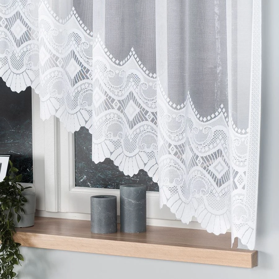 - Podcięcie na dole – ozdobnie wyprofilowana dolna krawędź podkreśla lekkość firanki.
