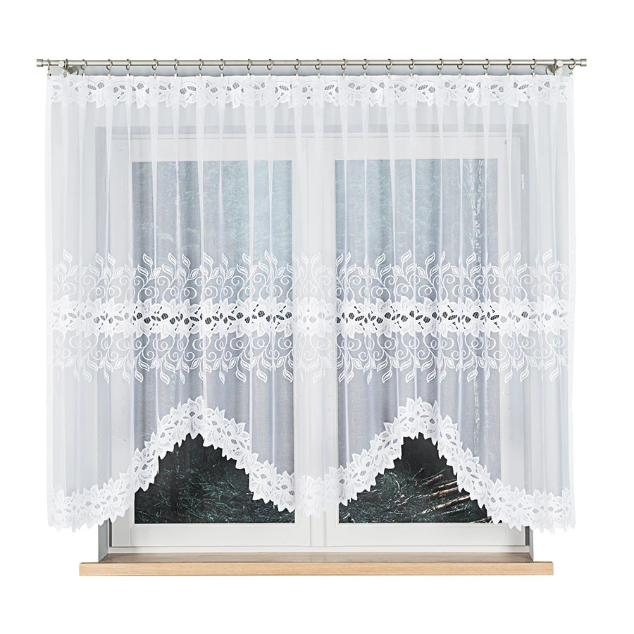 Dzięki ażurowej strukturze tkaniny firanka pięknie rozprasza światło, tworząc jasną i ciepłą atmosferę. Wzór w delikatne liście dodaje wnętrzu naturalnego uroku, a ozdobne podcięcie dolnej krawędzi tworzy efektowną, falującą linię, która podkreśla dekoracyjny charakter firany.