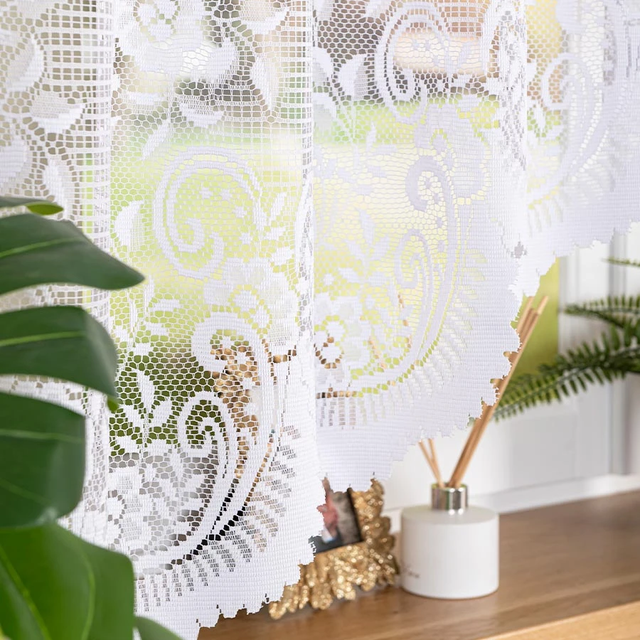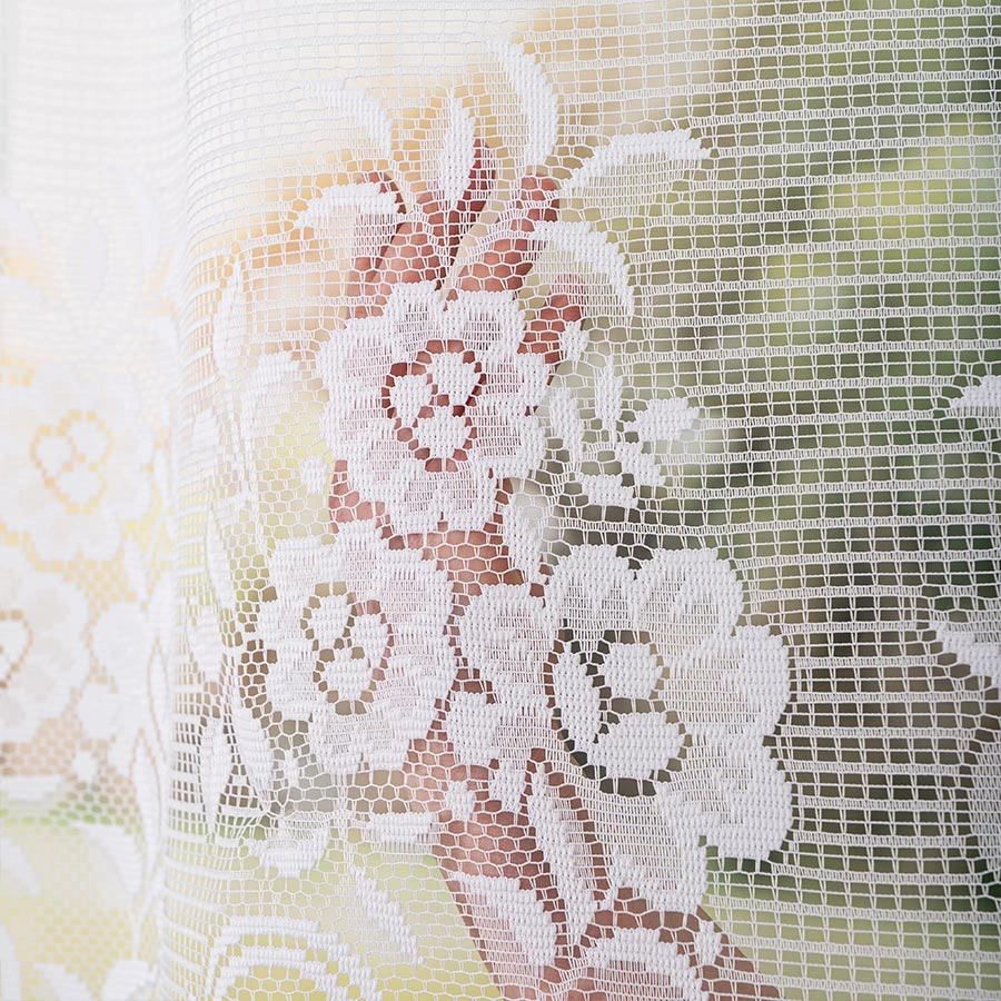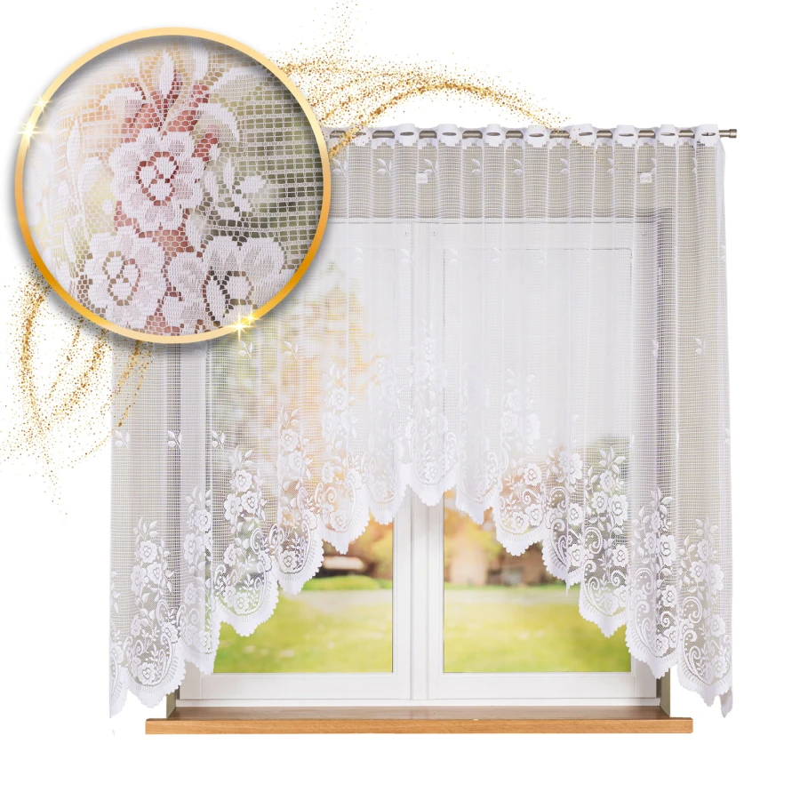 SARA to gotowa firanka żakardowa, która wprowadza do wnętrza spokój, światło i przytulność 🌿 Wykonana z białej, transparentnej tkaniny o delikatnej strukturze w krateczkę, zachwyca eleganckim motywem roślinnym i kwiatowym 🌼 Firanka pięknie się układa i nadaje pomieszczeniom miękkości i świeżości ☀️