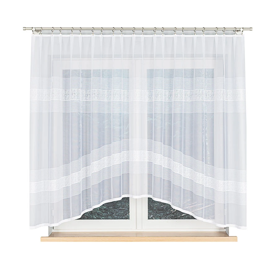 Firanka KLAUDYNA to stylowe połączenie prostoty i elegancji. Wykonana z wysokiej jakości białego żakardu, zachwyca poziomym układem wzoru z delikatnymi pasami i geometrycznymi zdobieniami. Dzięki subtelnemu podcięciu w dolnej części całość układa się miękko i lekko, tworząc harmonijną kompozycję na oknie.