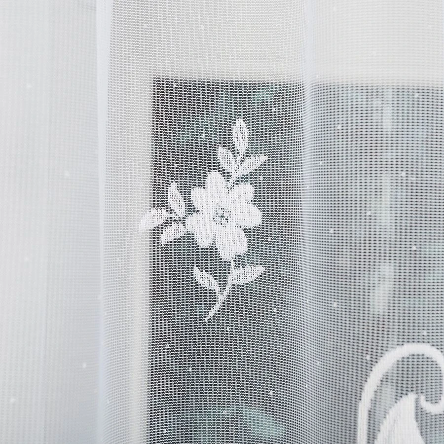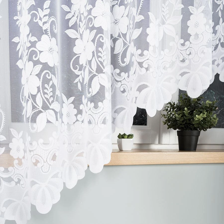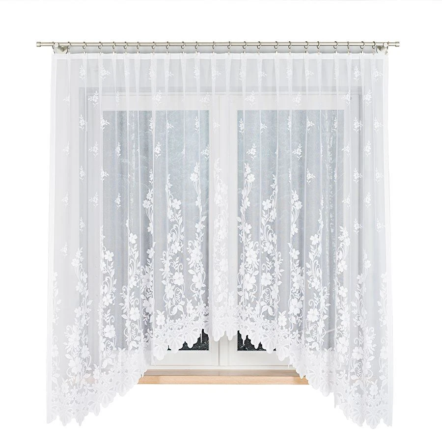 LUDWIKA o wymiarach 300x180 cm to gotowa firanka żakardowa z gęstym, kwiatowym wzorem i efektownym podcięciem w dolnej części. Zawieszana na żabki – bez taśmy marszczącej – idealna na okno o szerokości ok. 150 cm po zmarszczeniu.