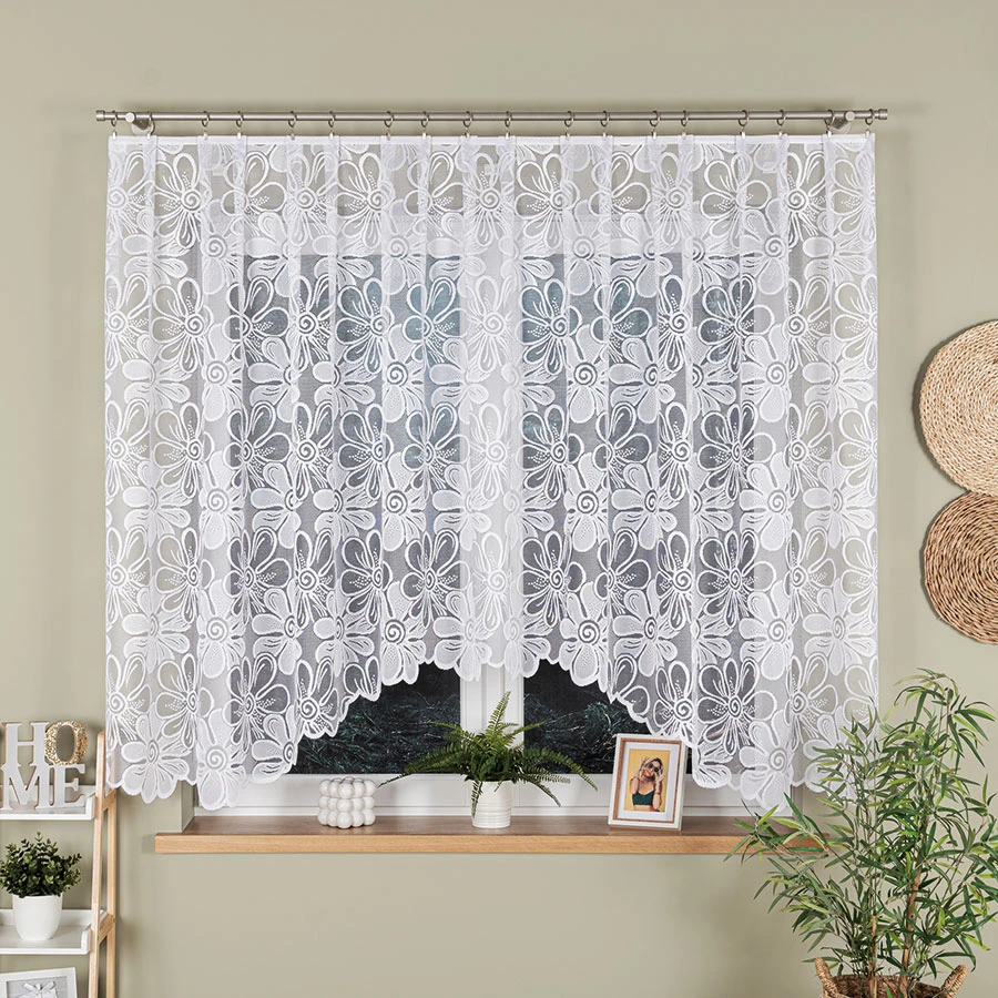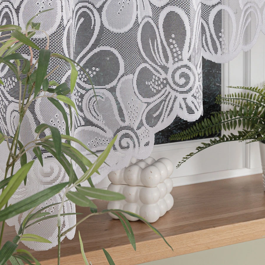 Wykonana z żakardowej tkaniny w kolorze białym, firanka doskonale rozprasza światło, nie przyciemniając wnętrza. Delikatna siateczka między wzorami sprawia, że pomieszczenie zyskuje na przestronności i jasności ☀️