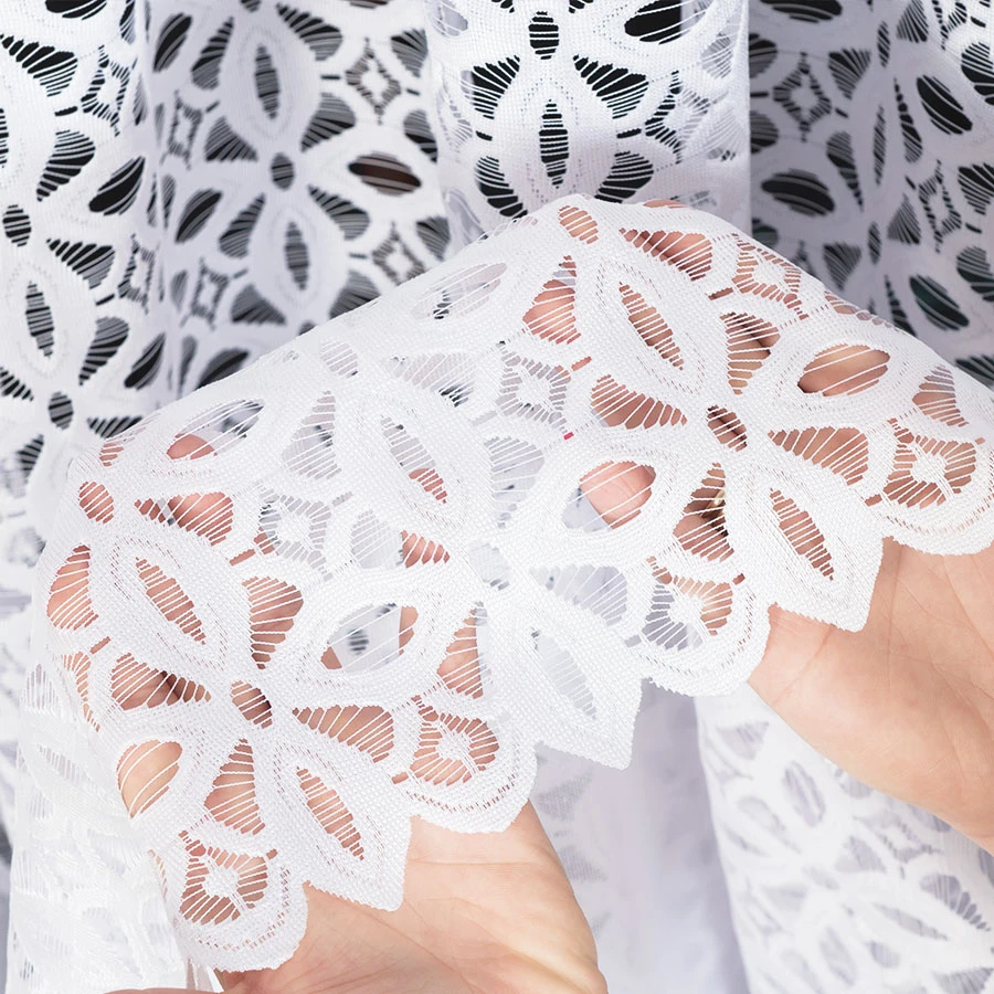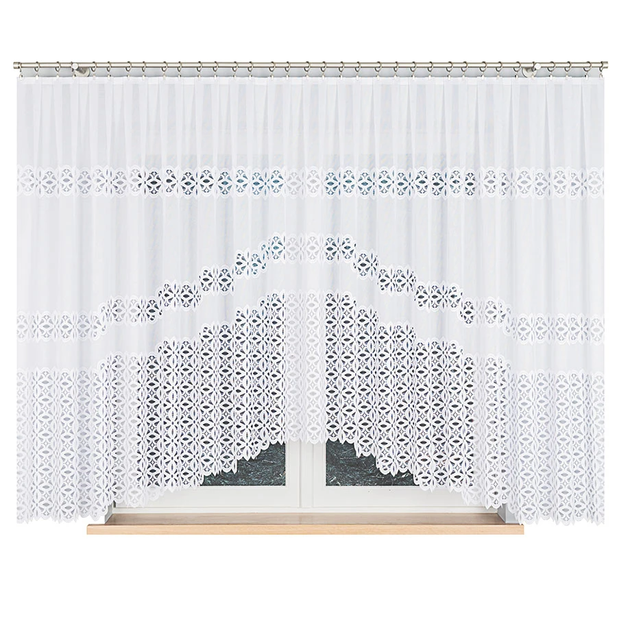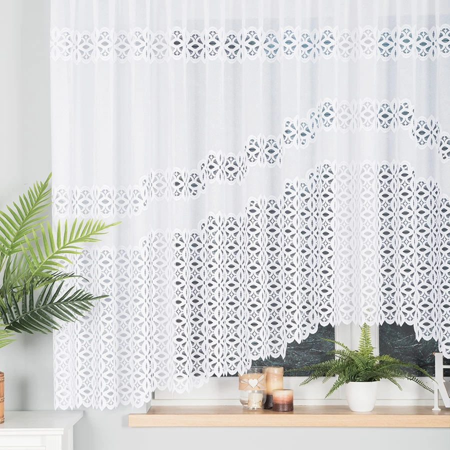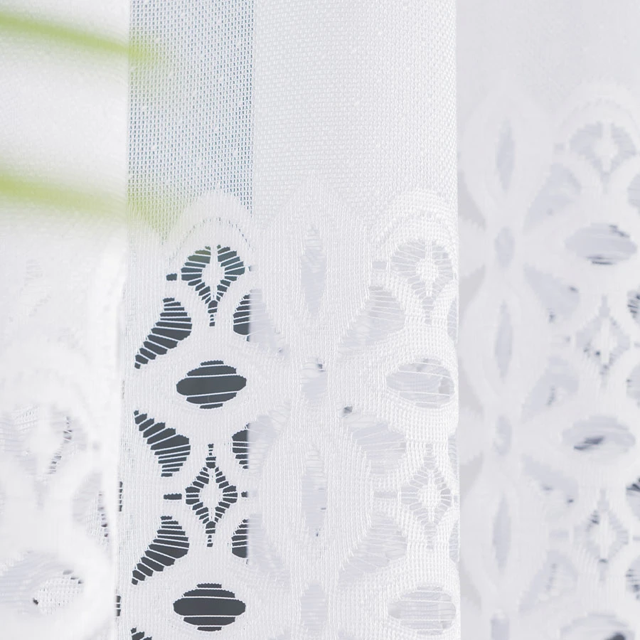 Firanka ADRIANNA to gotowe rozwiązanie dla tych, którzy cenią sobie połączenie funkcjonalności z subtelną dekoracyjnością. Wykonana z delikatnego, białego żakardu, ozdobiona została nowoczesnym, geometrycznym wzorem, który przyciąga wzrok, ale nie dominuje wnętrza. Dodatkowego charakteru dodaje jej ozdobne podcięcie u dołu – delikatna linia łuku wprowadza lekkość i optycznie otwiera przestrzeń przy oknie.