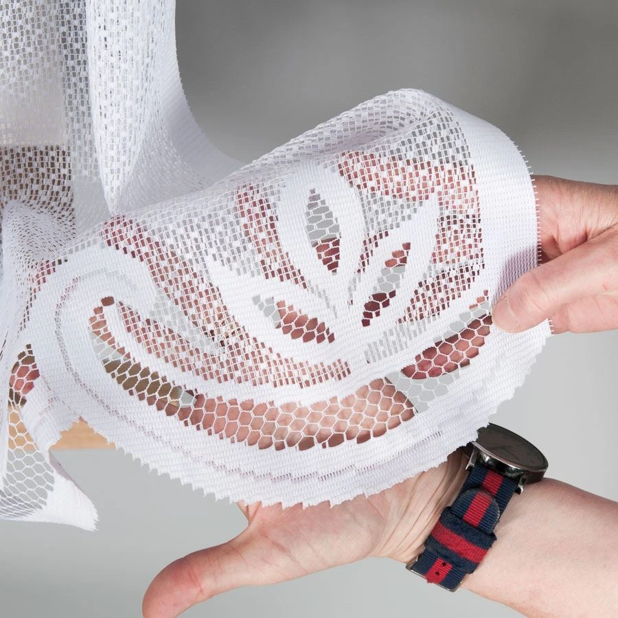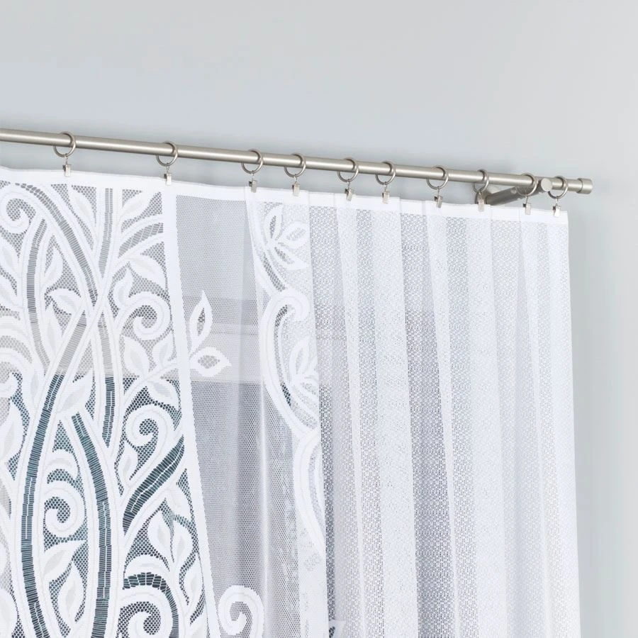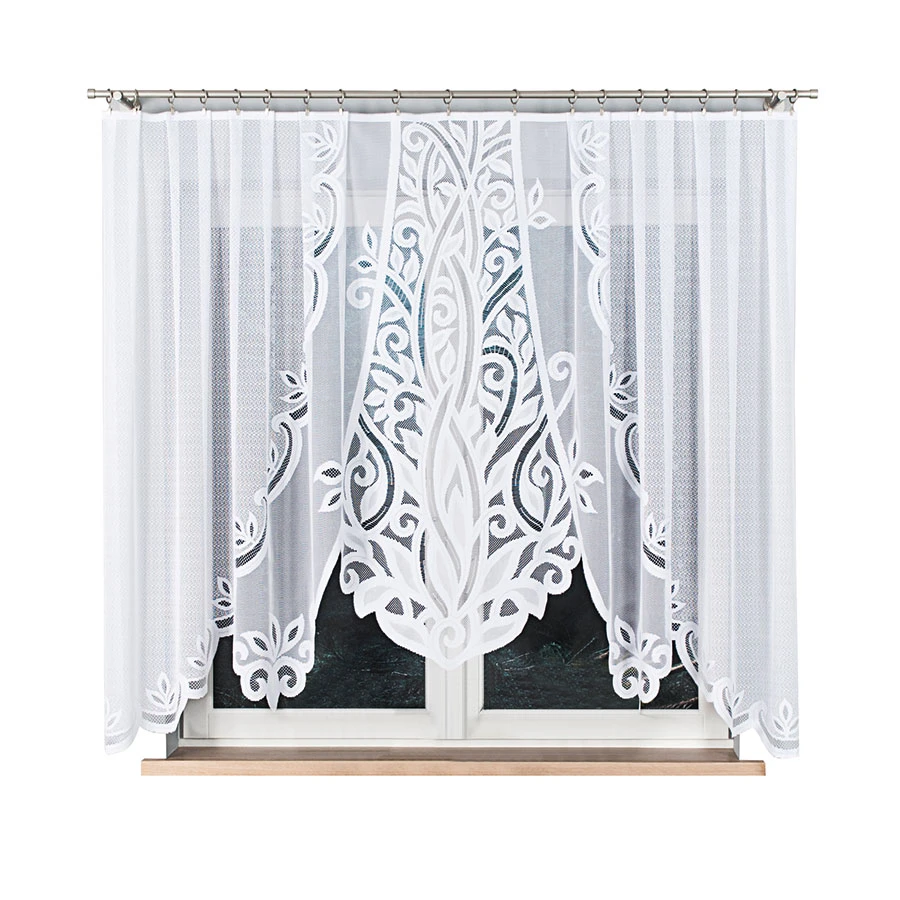 Ozdobne podcięcie w środkowej części tworzy wrażenie głębi i pięknie eksponuje przestrzeń przy oknie. Tkanina żakardowa jest lekka, półtransparentna, dzięki czemu do wnętrza wpada dużo naturalnego światła, zachowując jednocześnie prywatność.
