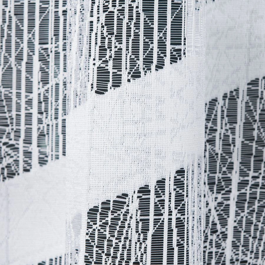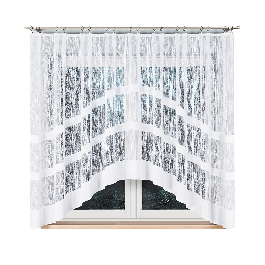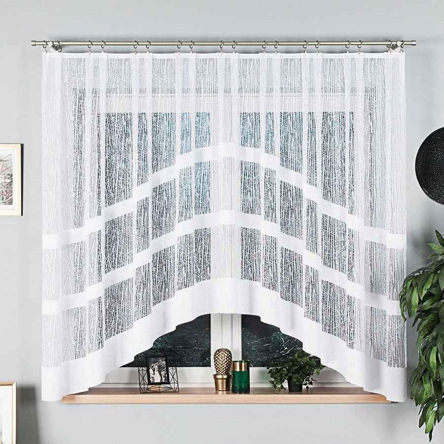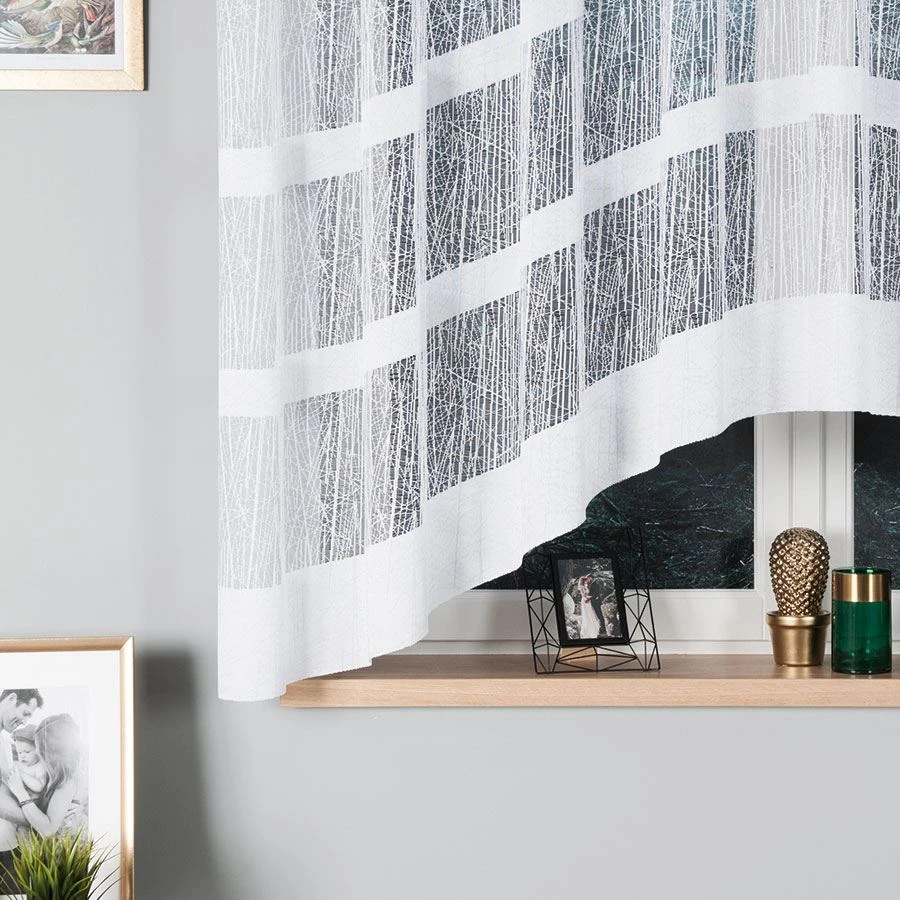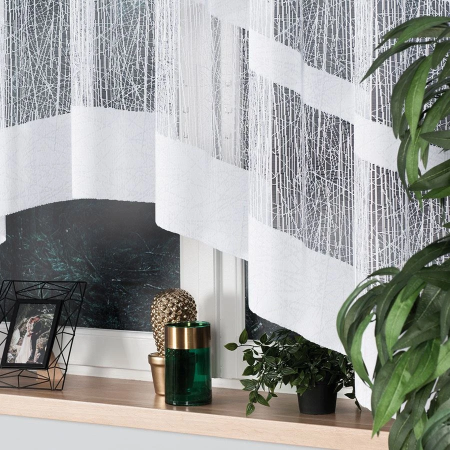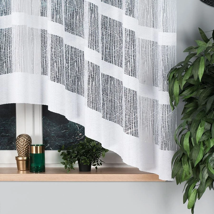 WIKTORIA w rozmiarze 310x160 cm to propozycja dla miłośników nowoczesnych, nieoczywistych wzorów. Firanka wykonana z białego żakardu przyciąga uwagę geometrycznym, subtelnie ażurowym motywem oraz dekoracyjnym podcięciem, które dodaje lekkości całej kompozycji. To doskonały wybór do salonu, kuchni, jadalni czy biura, gdzie chcesz wprowadzić świeży, a jednocześnie elegancki akcent.