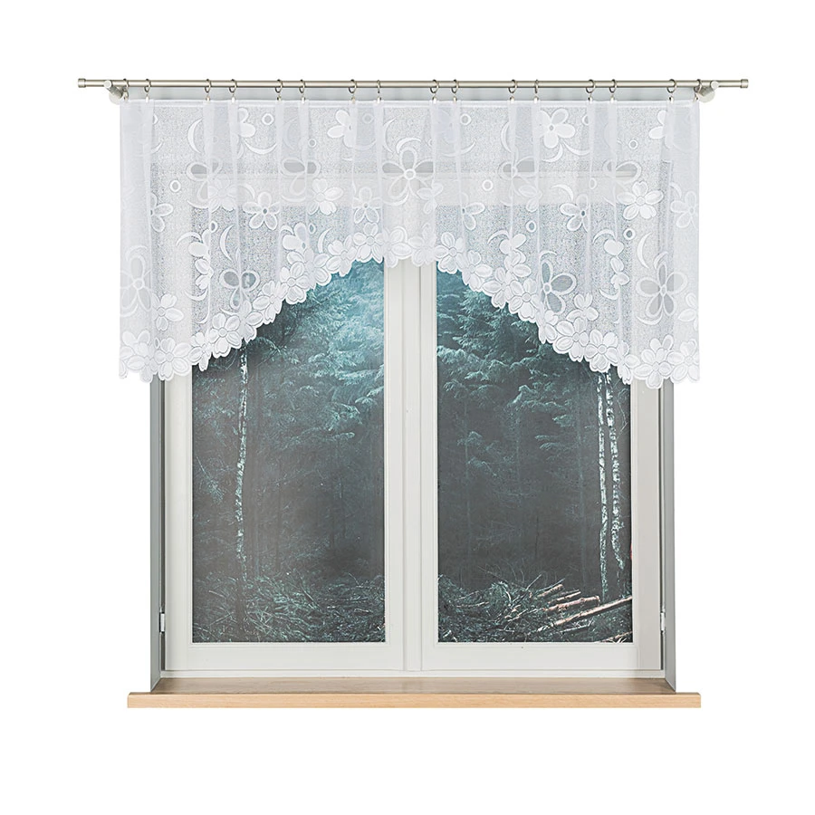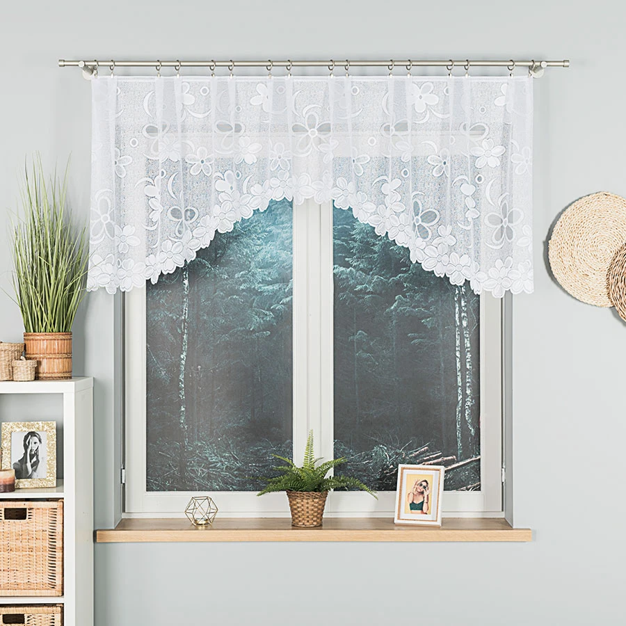 Wykonana z białego żakardu, firanka zachwyca florystycznym motywem – wyraźne kwiaty układają się w dekoracyjny pas, który doskonale kontrastuje z drobną siateczką tła 🌿 Efekt dopełnia podcięcie dolnej krawędzi 🌙 – łagodne, fantazyjne i bardzo kobiece.