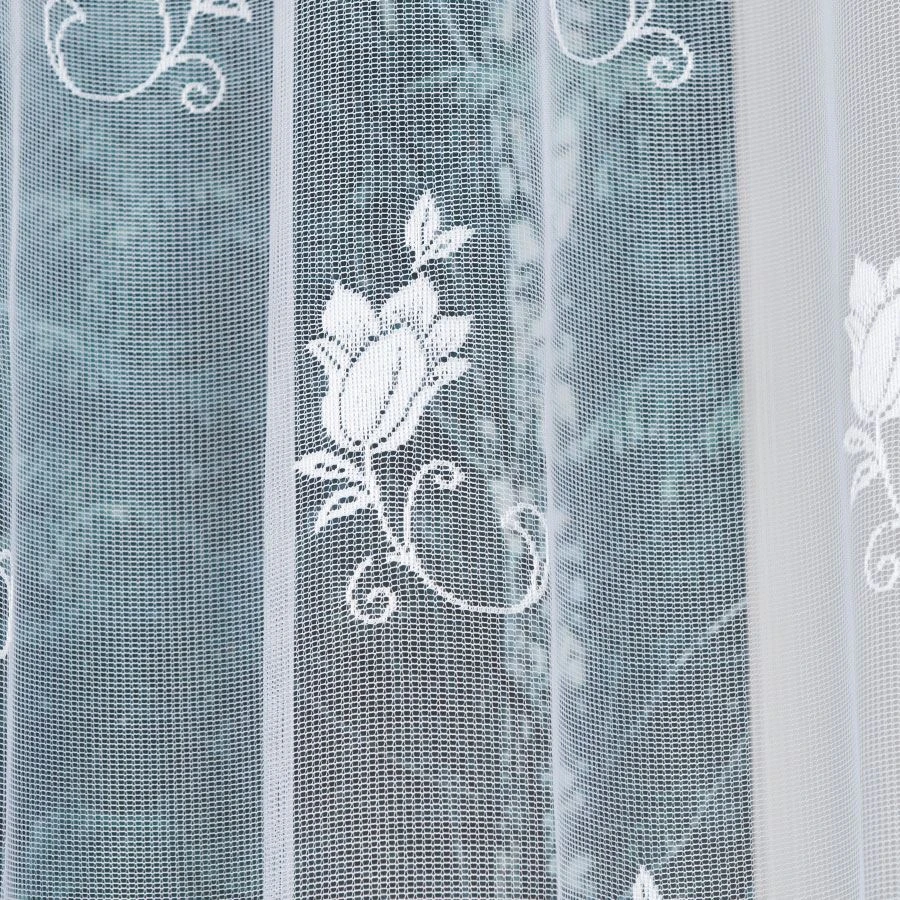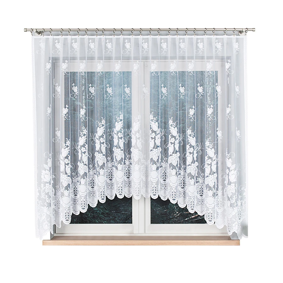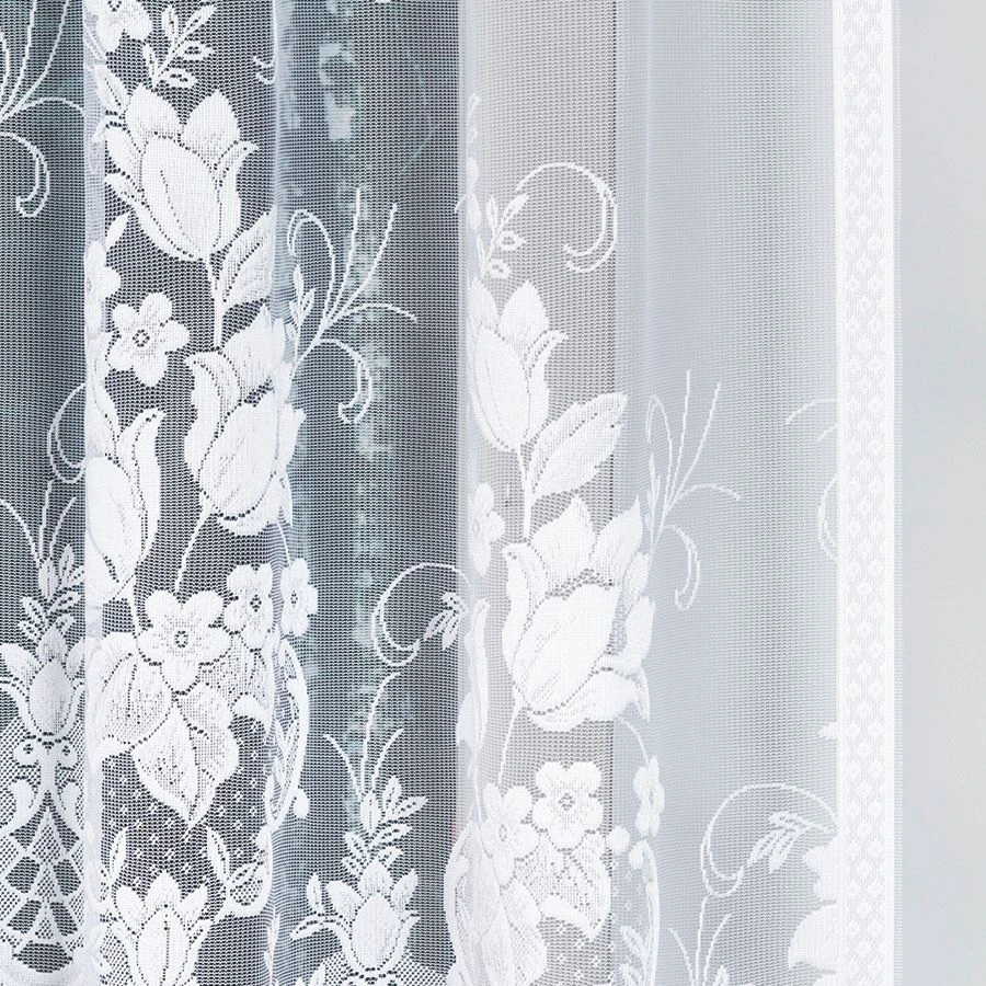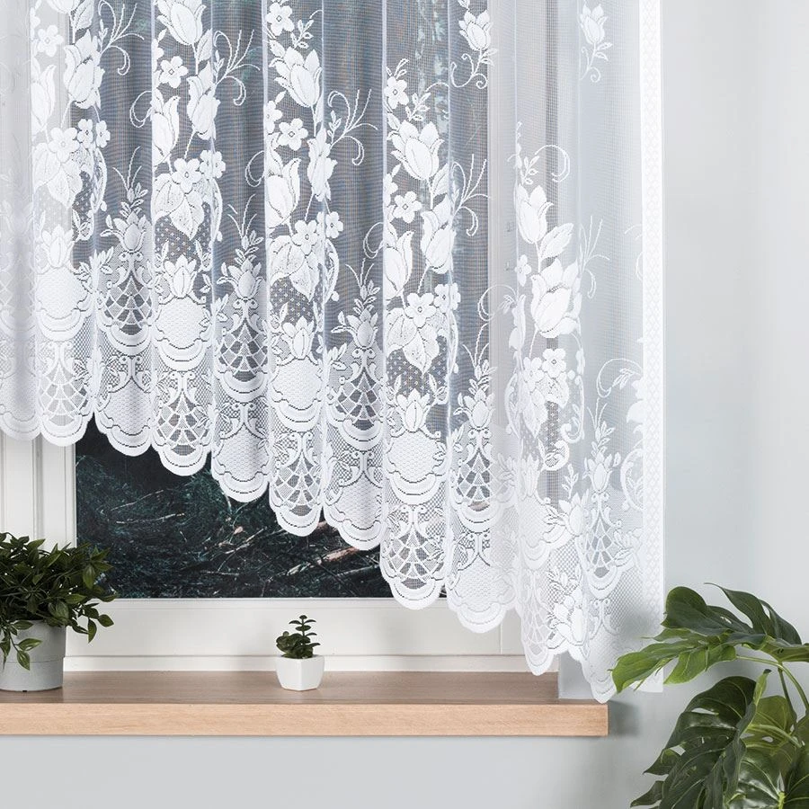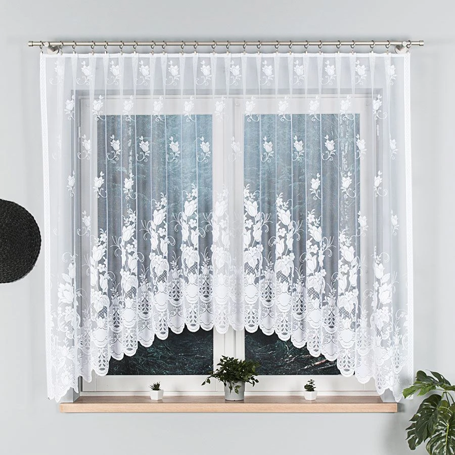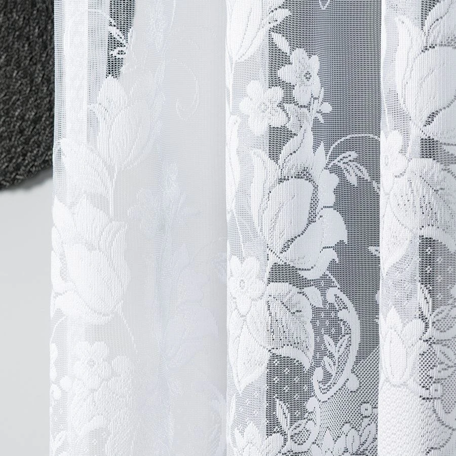 Firanka żakardowa EDYTA w rozmiarze 300x160 cm to piękna dekoracja, która przyciąga uwagę subtelnym, romantycznym wzorem kwiatowym. Wykonana z białego żakardu wysokiej jakości, pięknie rozprasza światło, nadając wnętrzu świeżości i lekkości. Ozdobne podcięcie dolne sprawia, że firanka układa się w eleganckie, falujące linie, które efektownie zdobią okno.