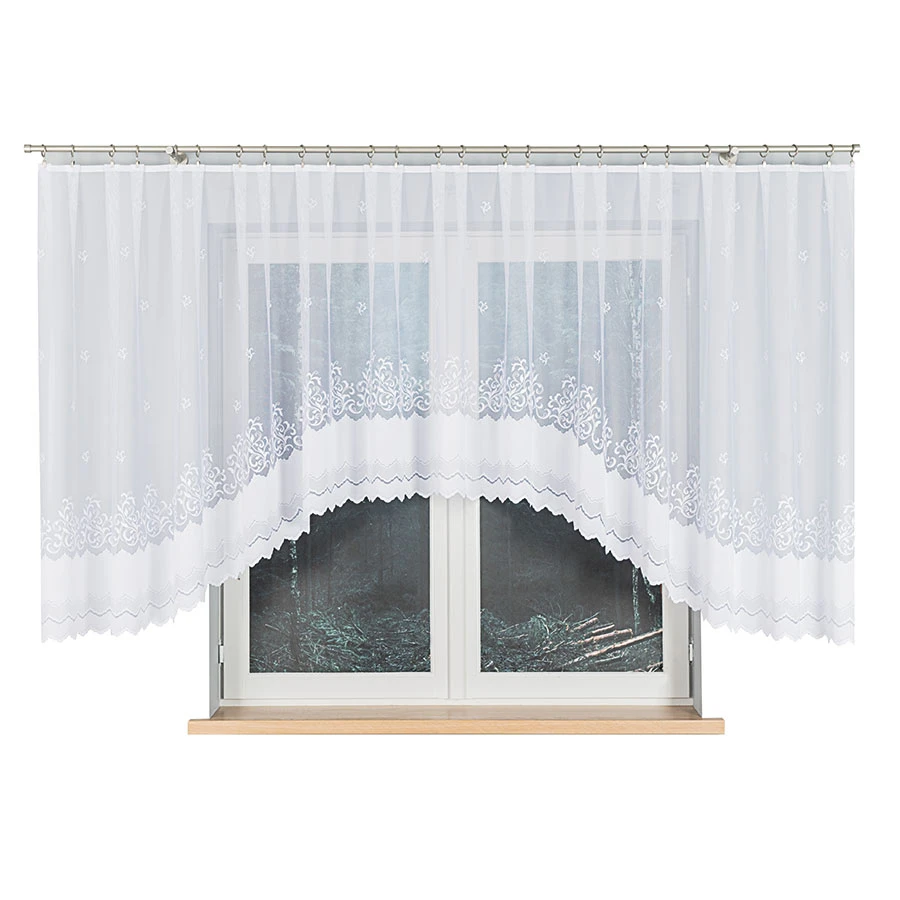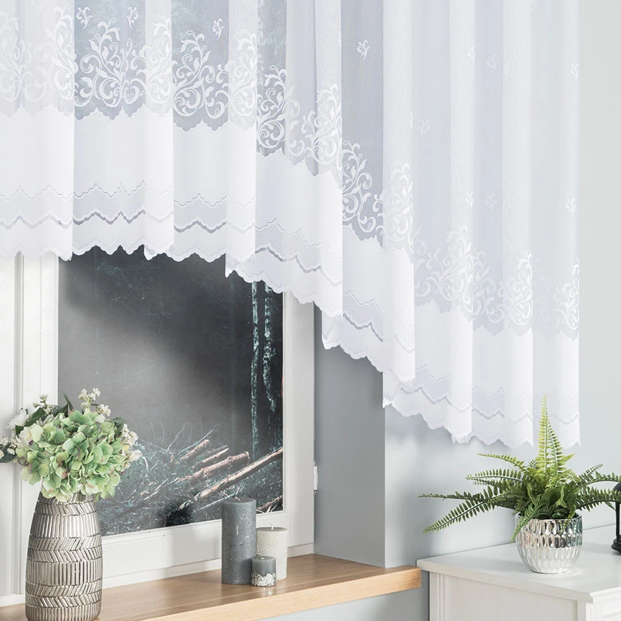 Dekoracyjne podcięcie w łuk oraz dolne ażurowe wykończenie z geometryczno-roślinnym wzorem 🌿 nadają firance wyjątkowego charakteru – delikatnie uzupełnia przestrzeń i wprowadza elegancki detal bez nadmiaru ozdób. Doskonale sprawdzi się w salonie, jadalni, kuchni lub pokoju dziennym.