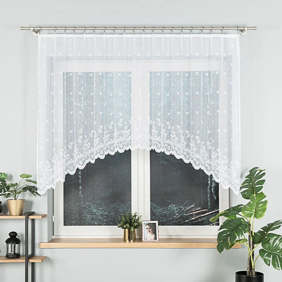 Podcięcie dolnej krawędzi 🌙 nadaje firance finezyjnego wykończenia i pięknie układa się na oknie. Delikatna falista linia współgra z kwiatowym motywem, podkreślając jego wdzięk i dodając wnętrzu romantycznej nuty.