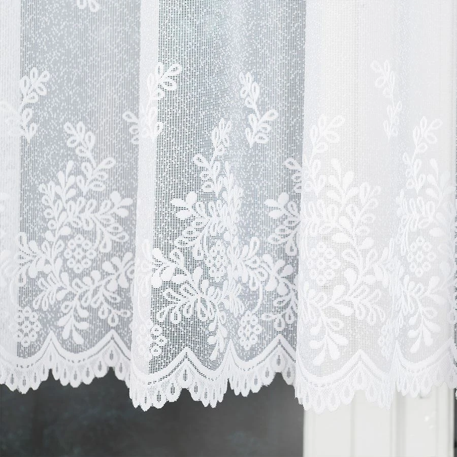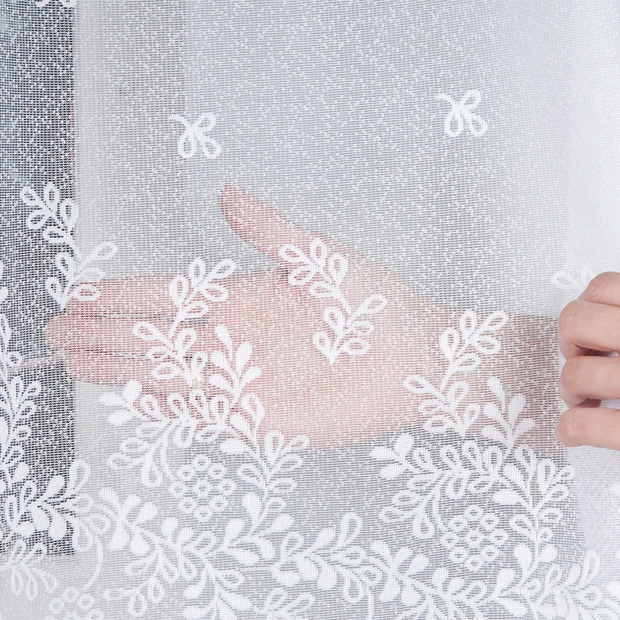 Tkanina żakardowa w odcieniu czystej bieli ozdobiona została gęstym, drobnym wzorem roślinnym 🌸 Rozmieszczony głównie w dolnej części firanki, motyw ten tworzy piękne przejście od lekkiej siateczki ku bogatszemu dołowi. To połączenie wygląda wyjątkowo elegancko i subtelnie jednocześnie.
