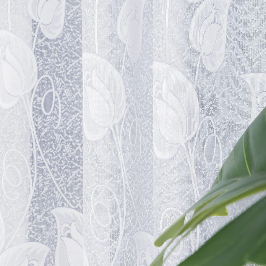 NORA w rozmiarze 500x160 cm to gotowa firanka żakardowa, która łączy w sobie ozdobny liściasty wzór i dekoracyjne podcięcie w kształcie łuku. Idealna do zawieszenia na karniszu o długości około 250 cm – świetnie sprawdzi się w salonie, jadalni, a także przy dużych drzwiach balkonowych.
