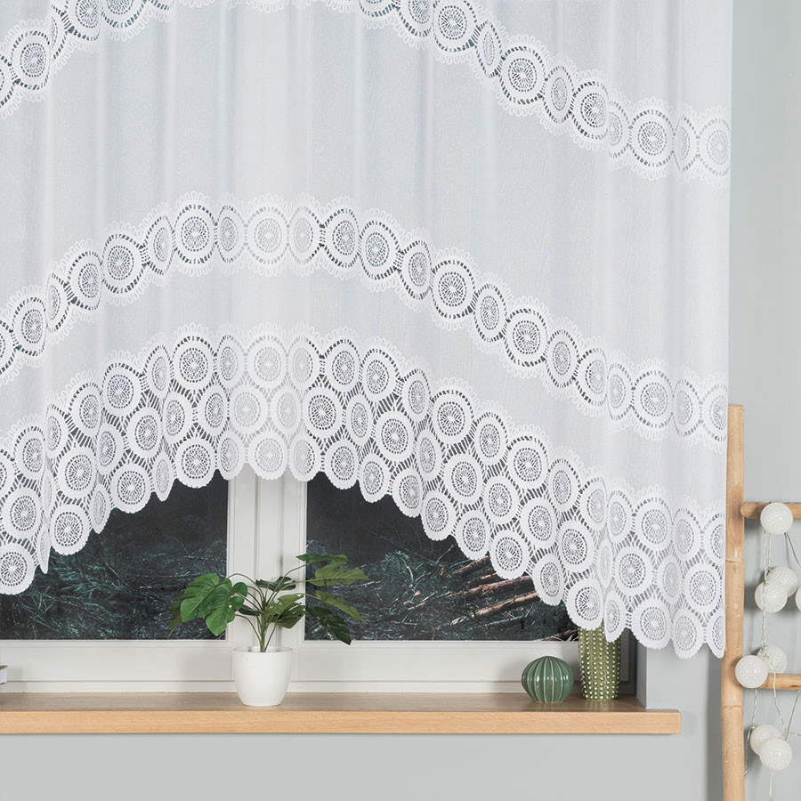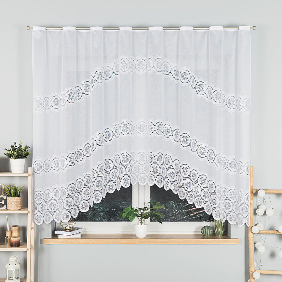 Firanka MARIA to wyjątkowe połączenie funkcjonalności i subtelnego wzornictwa. Wykonana z białego żakardu o delikatnej strukturze, zachwyca prostotą i elegancją. Jej dekoracyjny wzór – inspirowany motywami kwiatowymi i geometrycznymi – wprowadza do wnętrza harmonię, nie przytłaczając przy tym przestrzeni. 🌸✨ Dolna krawędź zakończona jest eleganckim podcięciem, które tworzy łagodną falę. To właśnie ten detal dodaje firance wizualnej lekkości i sprawia, że świetnie prezentuje się w różnych stylach wnętrz – od nowoczesnych po klasyczne. 🏡 Model MARIA wyróżnia się obecnością specjalnych otworów na karnisz – co pozwala na błyskawiczne zawieszenie bez użycia żabek czy tunelu. Wystarczy przełożyć przez drążek i gotowe! 🧩 Dzięki szerokości 250 cm, firanka idealnie pasuje na karnisz o długości **od 125 do 165 cm** – zapewniając naturalne, estetyczne marszczenie. 📏